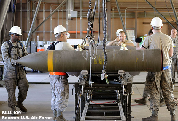 作为美军2,000磅级(约907kg)侵彻炸弹的中坚力量,BLU-109是真正的掩体杀伤利器。
