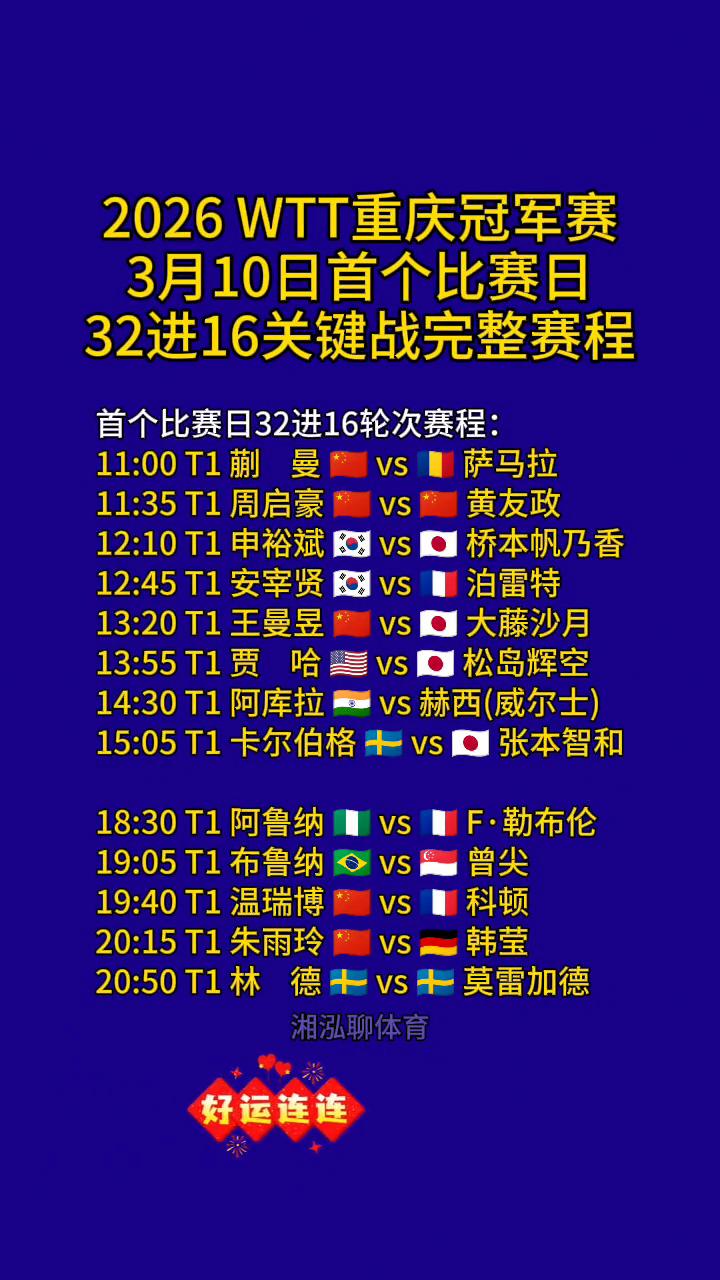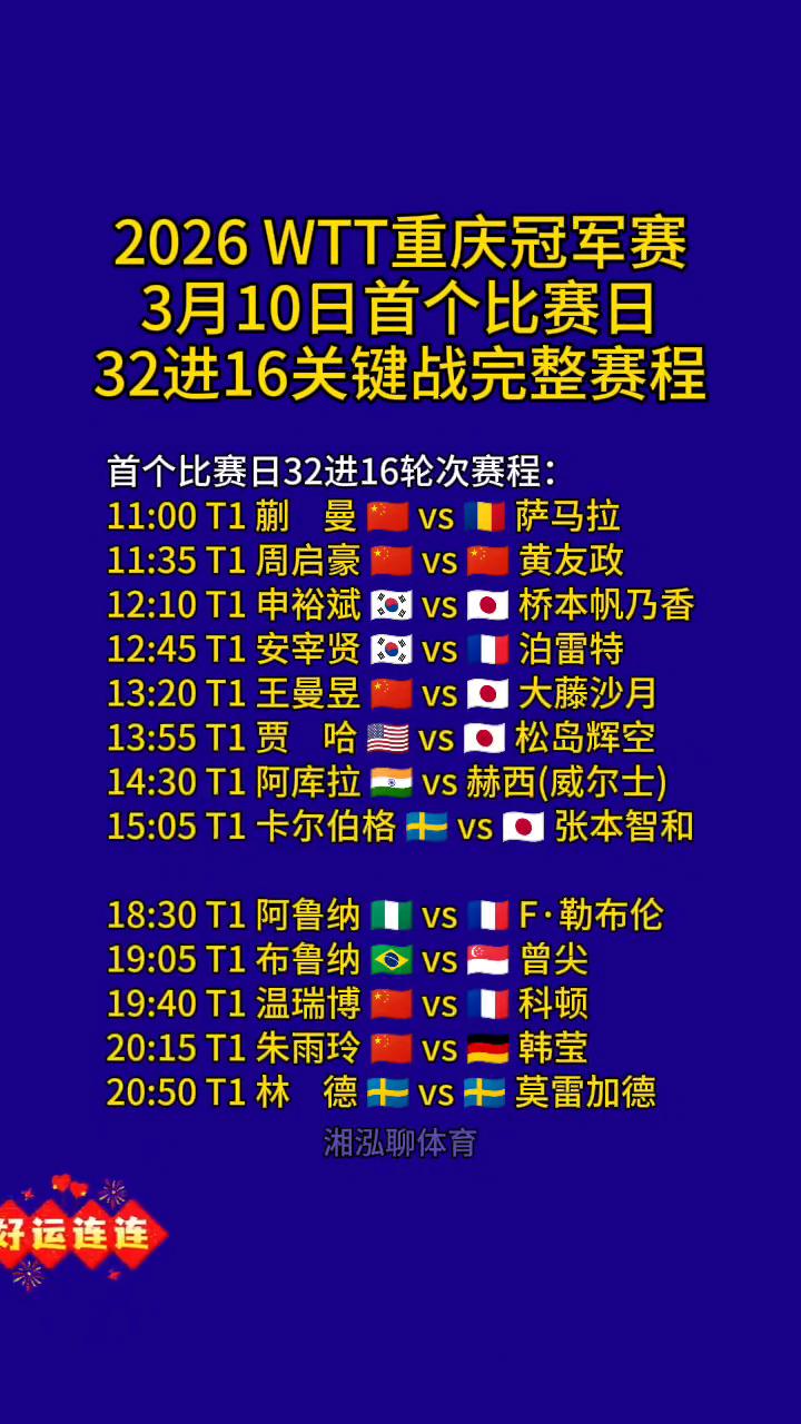 2026WTT重庆冠军赛3月10日首个比赛日32进16关键战完整赛程。 首个比赛日32进16轮次赛程: ·11:00T1蒯曼vs萨马拉。 ·11:35T1周启豪vs黄友政。 ·12:10T1申裕斌vs桥本帆乃香。 ·12:45T1安宰贤vs泊雷特。 ·13:55T1贾哈VS松岛辉空。 ·14:30T1阿库拉vs赫西(威尔士)。 ·15:05T1卡尔伯格+VS张本智和。 ·19:05T1布鲁纳vs曾尖。 ·19:40T1温瑞博vs韩莹。 ·20:15T1朱雨玲vs韩莹。 ·20:50T1林德+vs+莫雷加德。