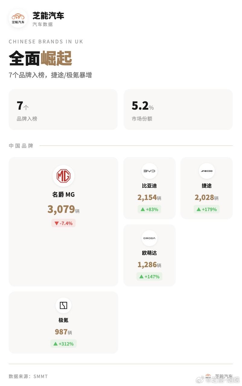 中国品牌在英国市场持续走强,多家车企销量大涨,比亚迪单月销量更是首次超越特斯拉。奇瑞、零跑等新选手也正式登陆当地市场,多个中国品牌跻身销量前列,从单点突破进入多品牌集体发力阶段。