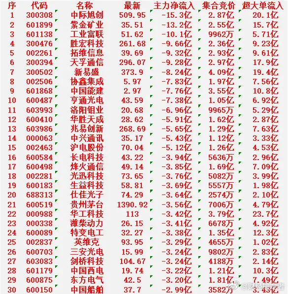 中际旭创:最新价 509.95元,净流入 -15.3亿元紫金矿业:最新价 35.51元,净流入 -13.2亿元工业富联:最新价 51.62元,净流入 -10.1亿元胜宏科技:最新价 261.68元,净流入 -9.66亿元拓维信息:最新价 39.69元,净流入 -9.32亿元今日看盘上证指数a股