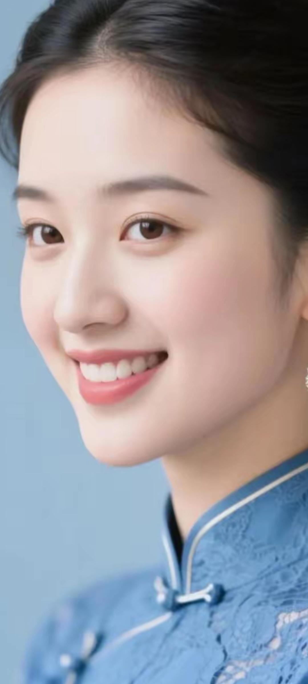 温柔微笑,蓝衣飘飘,宛如画中仙子。