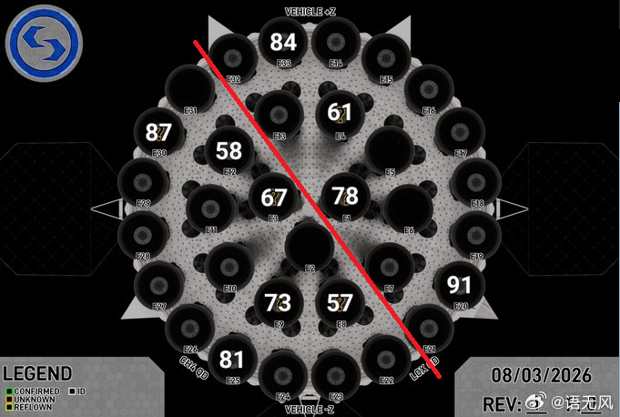 spacex 超重助推器Booster 19已顺利安放在星舰发射台2上, 并且完成了 10 台 Raptor V3 发动机的安装。V3版助推器的引擎布局专门做了调整,保证没有任何一台猛禽3的喷嘴中心,会近距离对准导焰槽的中央“直喷”。商业航天