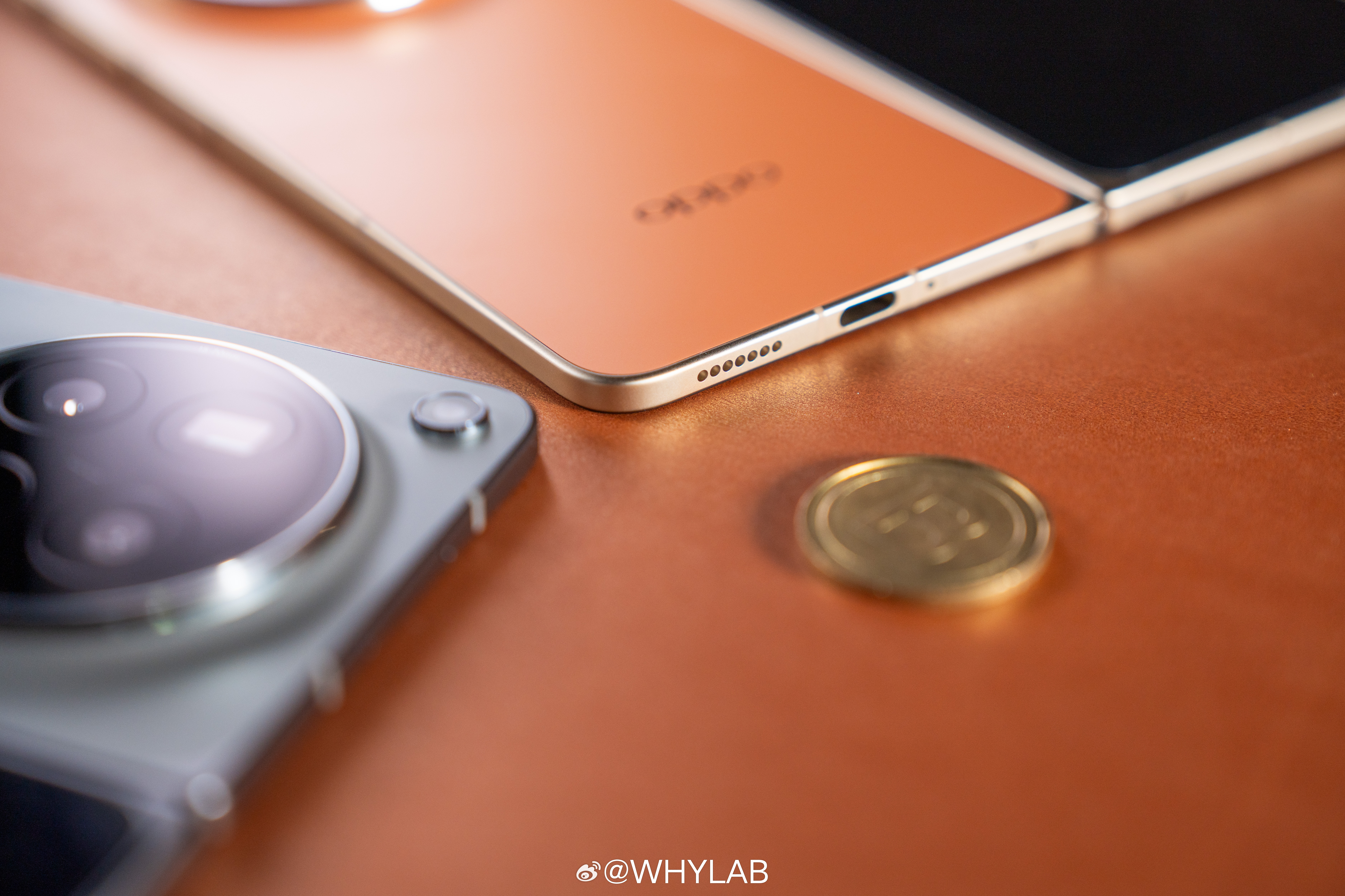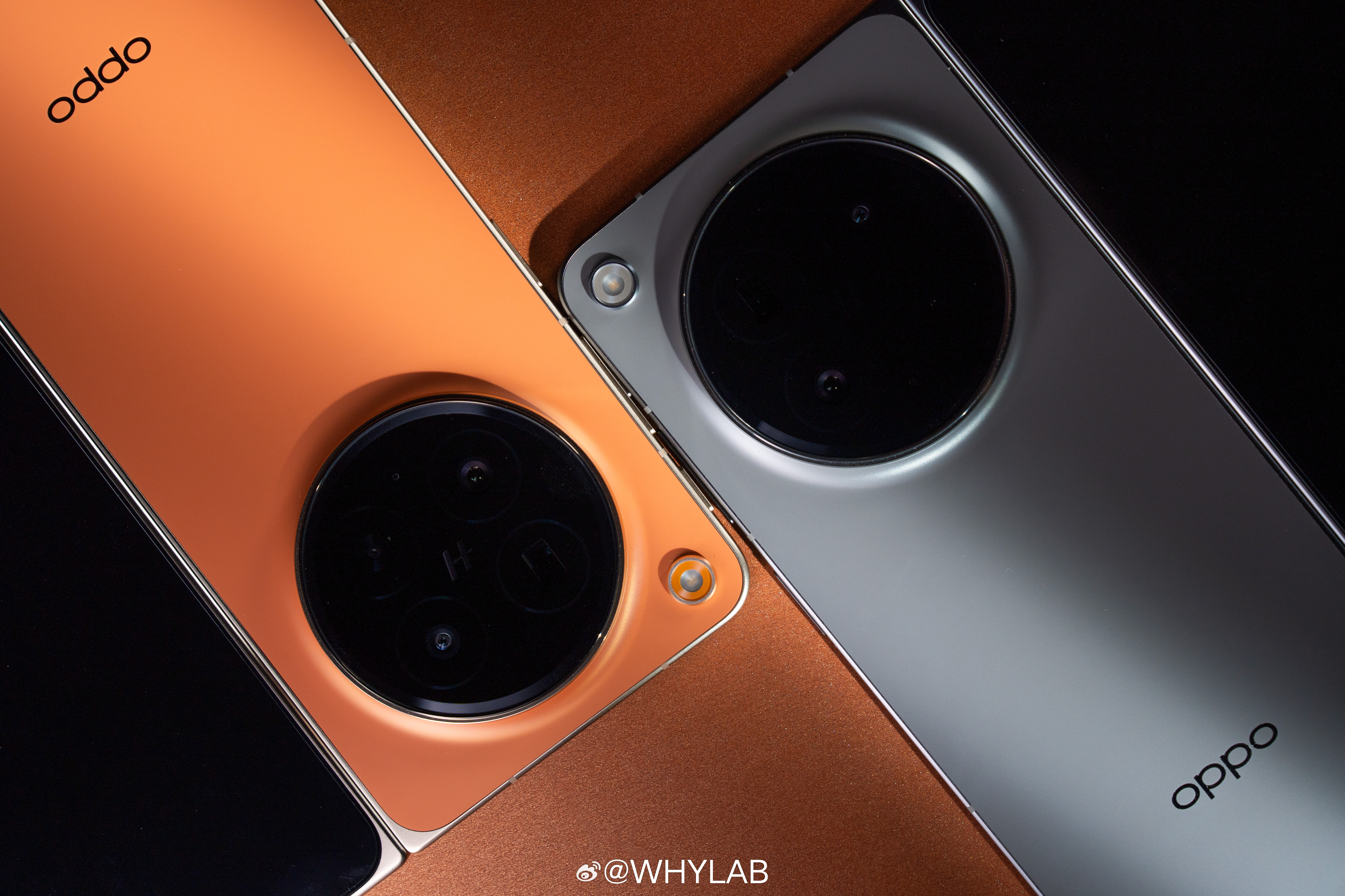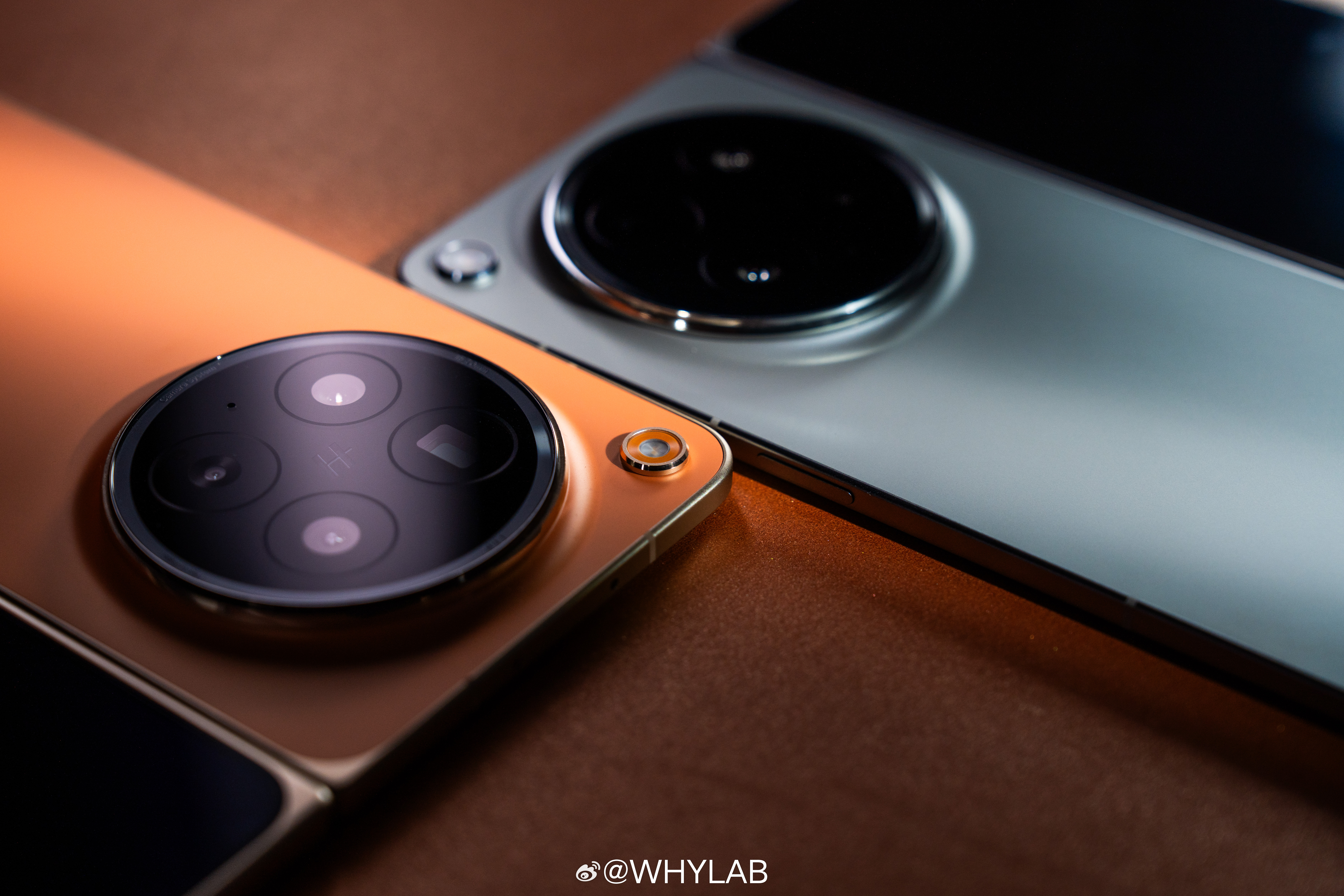WHYLAB图赏OPPO Find N6 真机上手,我拿到的是金橙、原钛两款配色,后背还是居中大圆环模组,哈苏 logo 放正中间,不过闪光灯挪到了左上角,辨识度比上一代更明显。