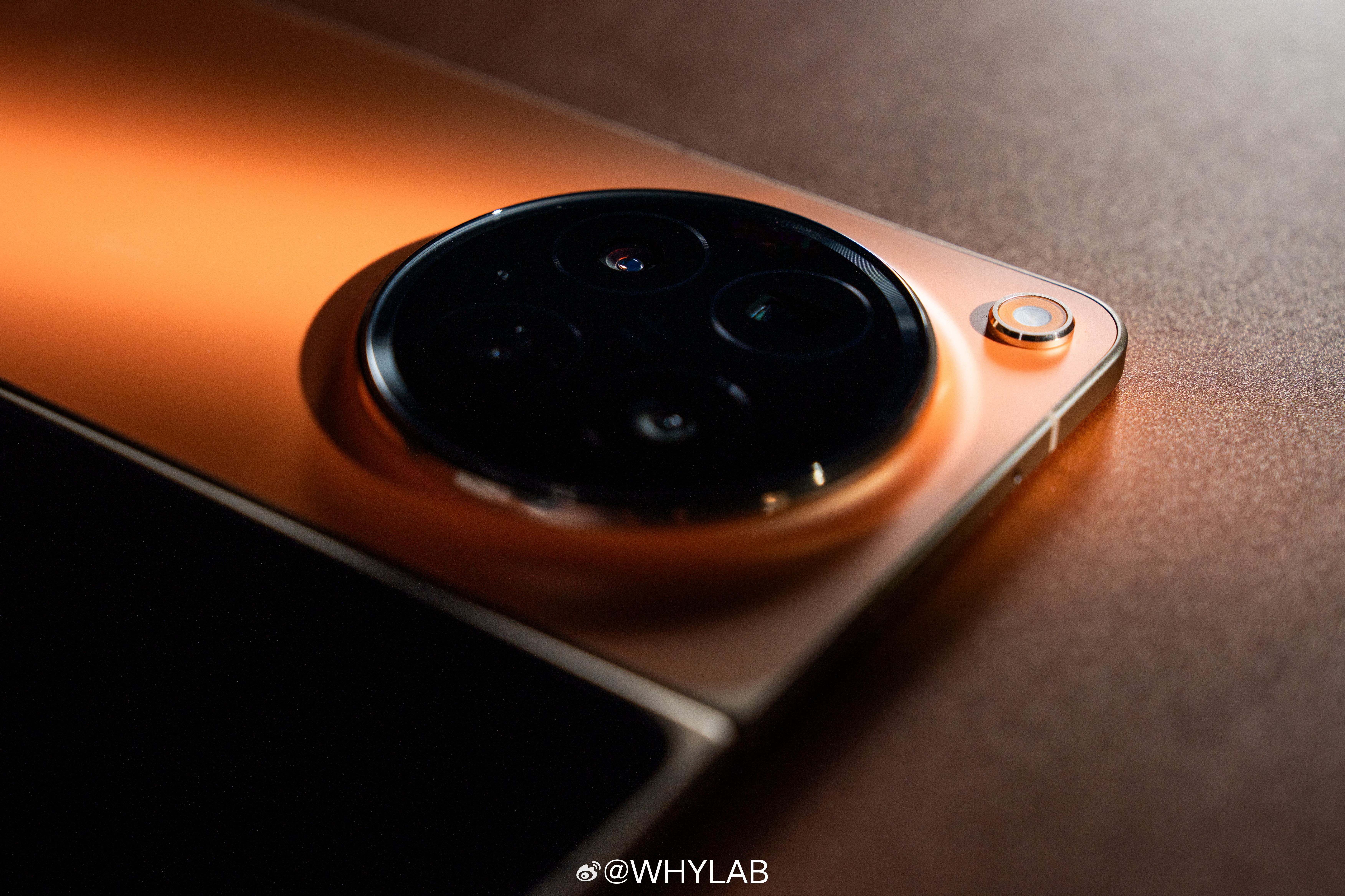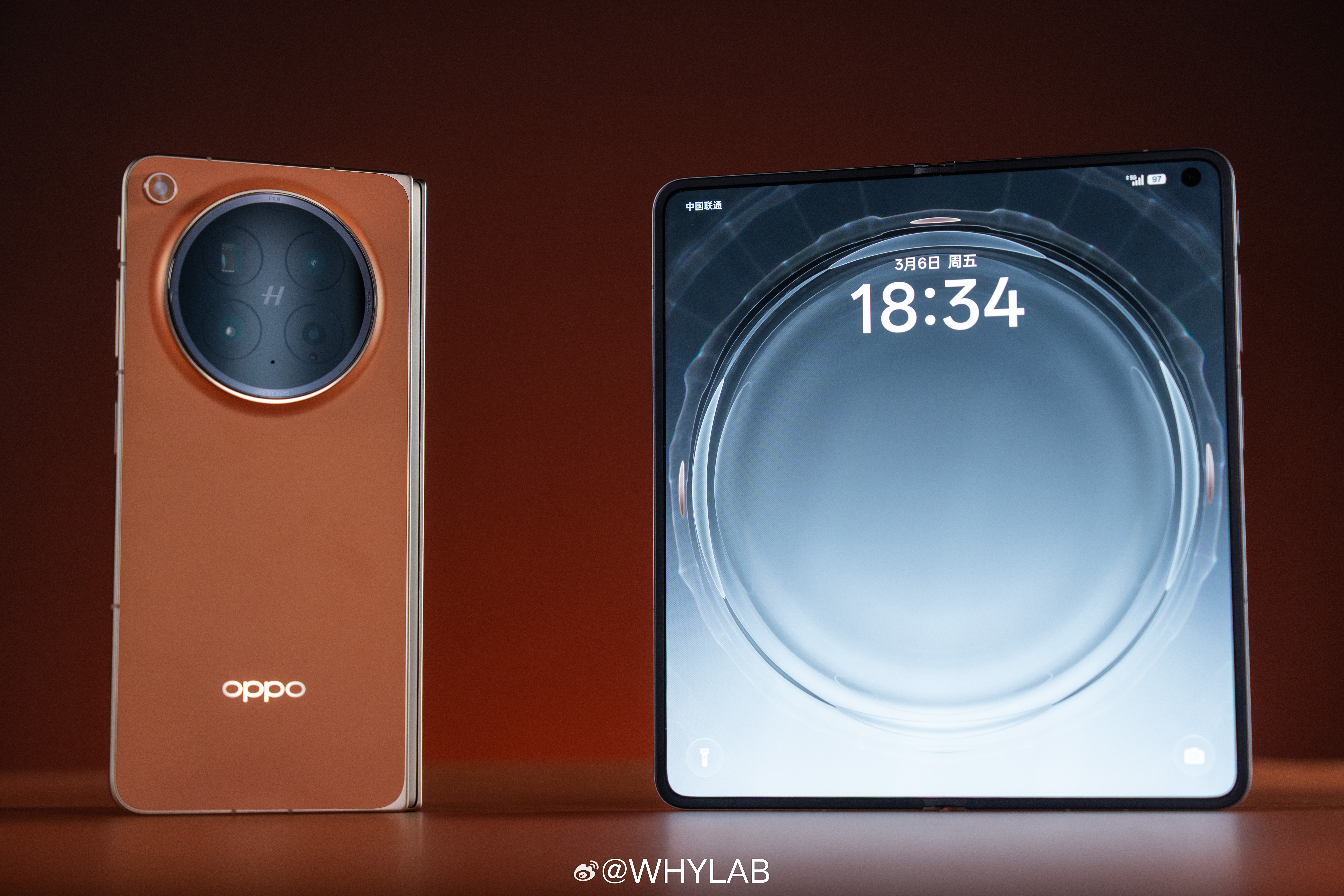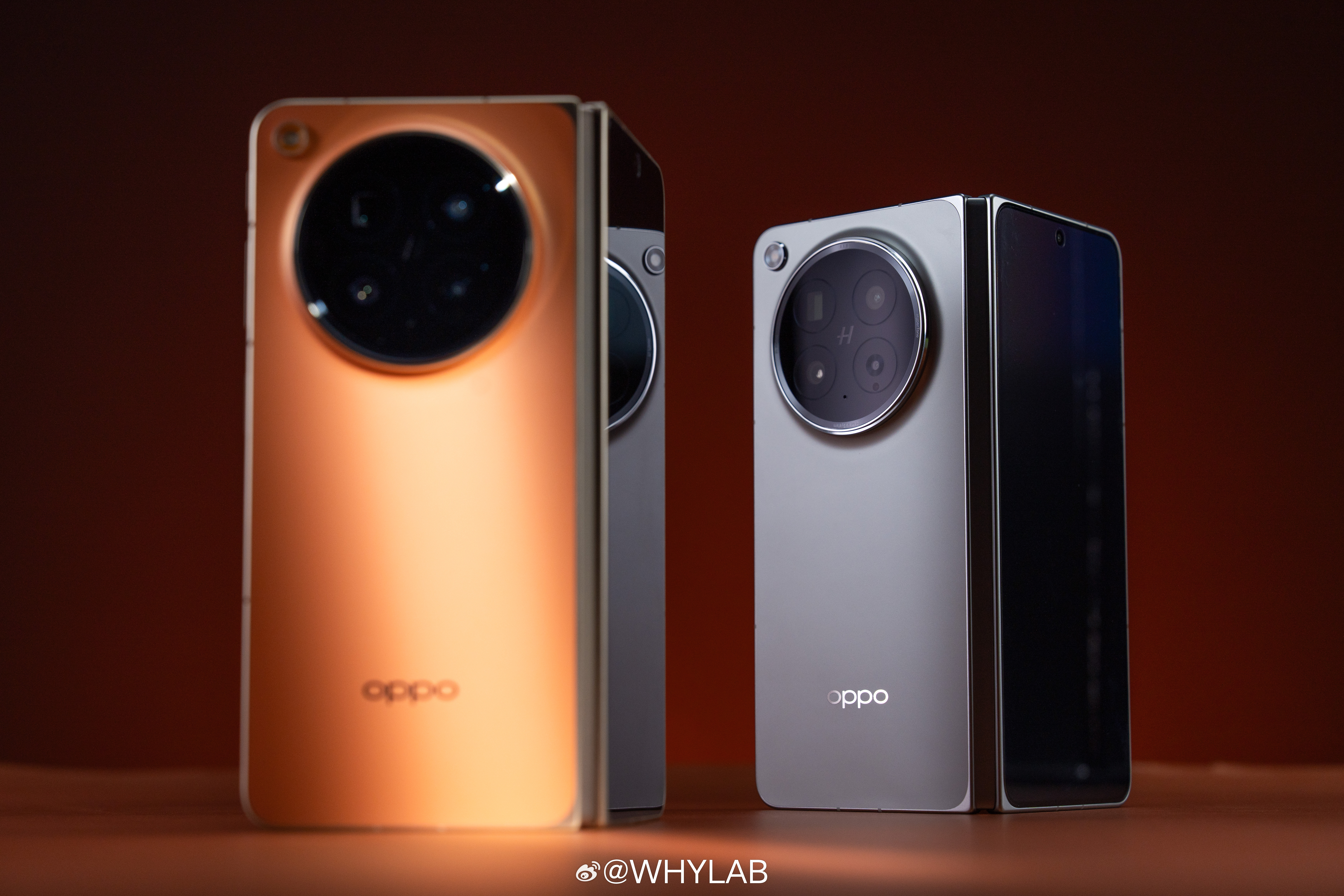 WHYLAB图赏OPPO Find N6 真机上手,我拿到的是金橙、原钛两款配色,后背还是居中大圆环模组,哈苏 logo 放正中间,不过闪光灯挪到了左上角,辨识度比上一代更明显。