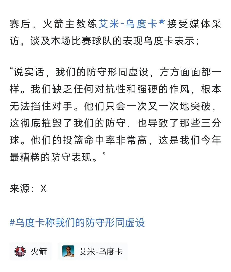 乌度卡来火箭三年了,从没在赛后采访说过自己一次不是,每次都在指责球员而没有反思自己,输球的所有教练,乌杜卡是唯一一个大家都知道赛后发言的人,缺乏强硬,匹配不了对方的强度。永远都是这几句话。一个赛季那么久。问题一大堆。申京能不能不要三分线拿球离框太远。之前是在壶顶策应给队友喂球以级攻框。 阿杜背打,强侧人员能不能清空,经常有人跑过来掏球失误,伊森能不能不要多干持球,做好底角三分防守。阿门推转换,阵地把球给出去,能不能不要无效运球在罚球线站死。这些问题一个赛季没有解决。
