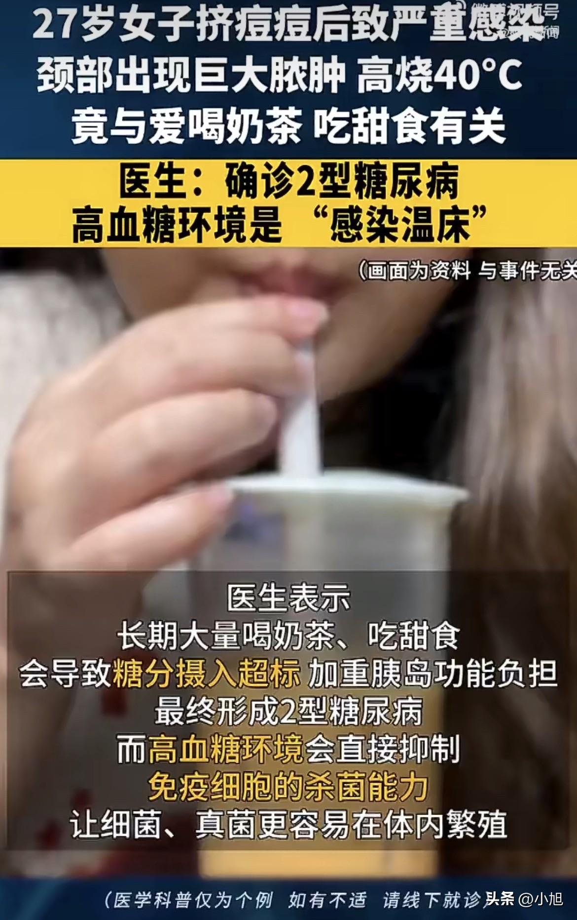 2月14号,深圳龙华区人民医院急诊科进来一个姑娘。别人都捧着花约会去了,她一个人发着高烧,烧到40度,整个人晕得站不稳,呼吸都费劲 。 医生一看她脖子,吓了一跳。整个颈部又红又肿,那个肿的范围早就不是一个小包了,顺着耳朵根子往下蔓延,一直肿到肩膀。用手一按,皮下面晃里晃荡的全是脓 。 赶紧抽血化验。结果出来那一刻,急诊医生倒吸一口凉气。 血糖,接近20mmol/L。正常人是多少?3.9到7.8。她超了两三倍。白细胞计数2万,正常上限是9000。降钙素原超标20多倍,超敏CRP超标37倍 。这组数字什么意思?严重感染,细菌已经在血里到处跑了。 紧急手术。医生切开脖子那一刻,黄白色的脓液混着烂肉一样的组织,哗哗往外流。术后每天排出来的脓,超过50毫升 。脓液培养结果出来了,金黄色葡萄球菌感染,合并2型糖尿病 。 小姑娘躺在病床上,怎么都想不通。家里没糖尿病史,自己才27岁,怎么就摊上这事了? 医生一问生活习惯,全明白了。 小林毕业后就一个人在深圳打拼,上班时间长,下班累成狗,根本没力气运动。但她有个嗜好——喝奶茶。平时每周至少三四杯,忙起来一天能灌三杯,蛋糕饼干当零食,这几年眼看着吹气一样胖起来 。 其实身体早给过信号。前段时间她总觉得口干舌燥,喝再多水也不解渴,厕所跑得特别勤。这就是典型的“三多一少”早期症状——多饮、多尿。但她以为是喝水多正常排尿,根本没往心里去 。 一周前,她发现脖子上长了个小包,米粒大,看着跟普通痘痘没两样。随手就挤了。挤完那个地方开始发红、肿胀,疼得厉害。她去社康开了点药膏抹,结果越抹越严重,直到高烧呼吸困难才爬去医院 。 医生说,小林这是典型的“高血糖+挤痘痘”双重打击。 长期大量喝奶茶吃甜食,糖分摄入超标,胰腺天天加班最后干不动了,胰岛素抵抗形成,2型糖尿病就这么来的。血糖高了之后,血液里都是糖,这玩意儿对细菌来说就是“培养液” 。 更要命的是,高血糖环境会直接抑制免疫细胞的杀菌能力 。白细胞本来是人体的“大内高手”,现在高血糖让它们反应迟钝,看见细菌都不想动了。金黄色葡萄球菌本来就广泛存在于皮肤表面,平时不致病,这下从挤破的缺口长驱直入,在皮下快速繁殖,几天时间就发展成巨大脓肿 。 有研究数据显示,糖化血红蛋白(血糖控制指标)在8%到9%之间的糖尿病患者,发生皮肤软组织感染和骨感染的风险,比血糖控制好的人高出33% 。小林入院时的血糖水平,早就在这个危险区间里了。 现在小林的炎症指标慢慢下来了,脓也少了。但因为脓肿面积太大,侵犯了头皮、耳廓、肩部的皮下组织,皮肤坏死范围广。后续不光要长期抗感染,还得面临坏死组织切除、皮肤修复这些手术 。 最麻烦的是血糖。27岁的小姑娘,往后的日子得终身管理血糖。甜食基本告别,胰岛素或者降糖药可能得一直用下去 。 湖南省中西医结合医院内分泌科主任何霞说过一句话:感染可能是身体发出的血糖危机警报 。很多年轻人长期处于“隐形高血糖”状态,自己根本不知道。当感染发生时,身体的应激反应会使血糖进一步飙升,感染迅速恶化,形成“感染加重高血糖,高血糖加重感染”的恶性循环 。 小林平时那些症状——累、口干、上厕所多,都是警报。但她跟大多数年轻人一样,觉得糖尿病是老年病,跟自己没关系。直到这次进医院才查出来,血糖早就高得吓人了。 那个被她挤掉的“痘痘”,其实也是警报。 高血糖状态下,皮肤本来就脆弱。长期高血糖会损伤血管内皮,导致微循环变差,皮肤细胞的修复与再生能力下降。同时还会损害外周感觉神经末梢,对疼痛感觉变得迟钝 。那个米粒大的小包,可能根本不是普通痘痘,而是毛囊炎或者疖肿,是皮肤感染的最初表现。 医生说得很直白,高血糖状态下,感染有三个特点:不容易控制,抗生素效果差;进展快,几天就发展成巨大脓肿;并发症多,感染反过来让血糖更高,恶性循环 。 小林今年才27岁。一个人在深圳打拼,没时间运动,靠奶茶续命。这描述听着耳熟吗?多少在大城市漂着的年轻人,过的都是这种日子。 评论区聊聊吧。你一天喝几杯奶茶?上次查血糖是什么时候?