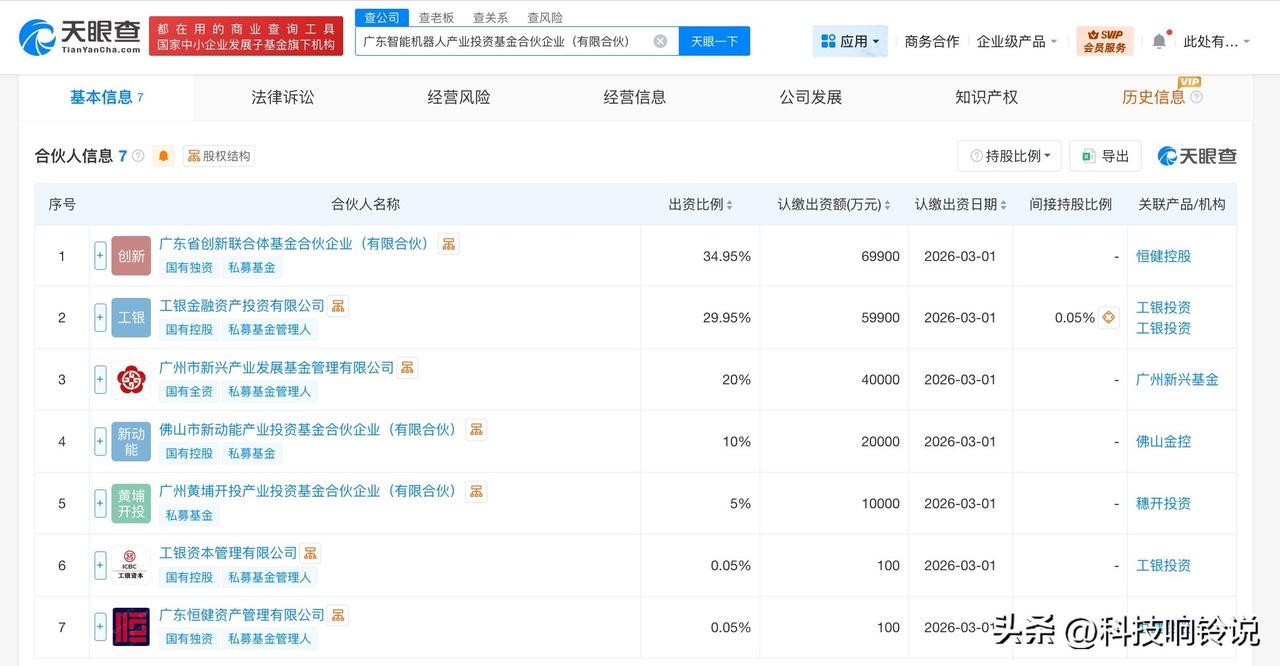 【广东智能机器人产业投资基金登记成立 出资额20亿】 天眼查工商信息显示,近日,广东智能机器人产业投资基金合伙企业(有限合伙)成立,执行事务合伙人为工银资本管理有限公司、广东恒健资产管理有限公司,出资额20亿人民币,经营范围为以私募基金从事股权投资、投资管理、资产管理等活动。合伙人信息显示,该基金由广东省创新联合体基金合伙企业(有限合伙)、工银金融资产投资有限公司、广州市新兴产业发展基金管理有限公司等共同出资。 天眼查信息: