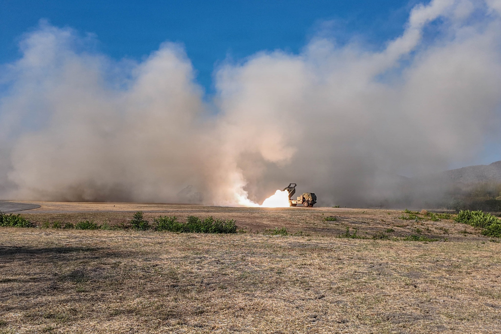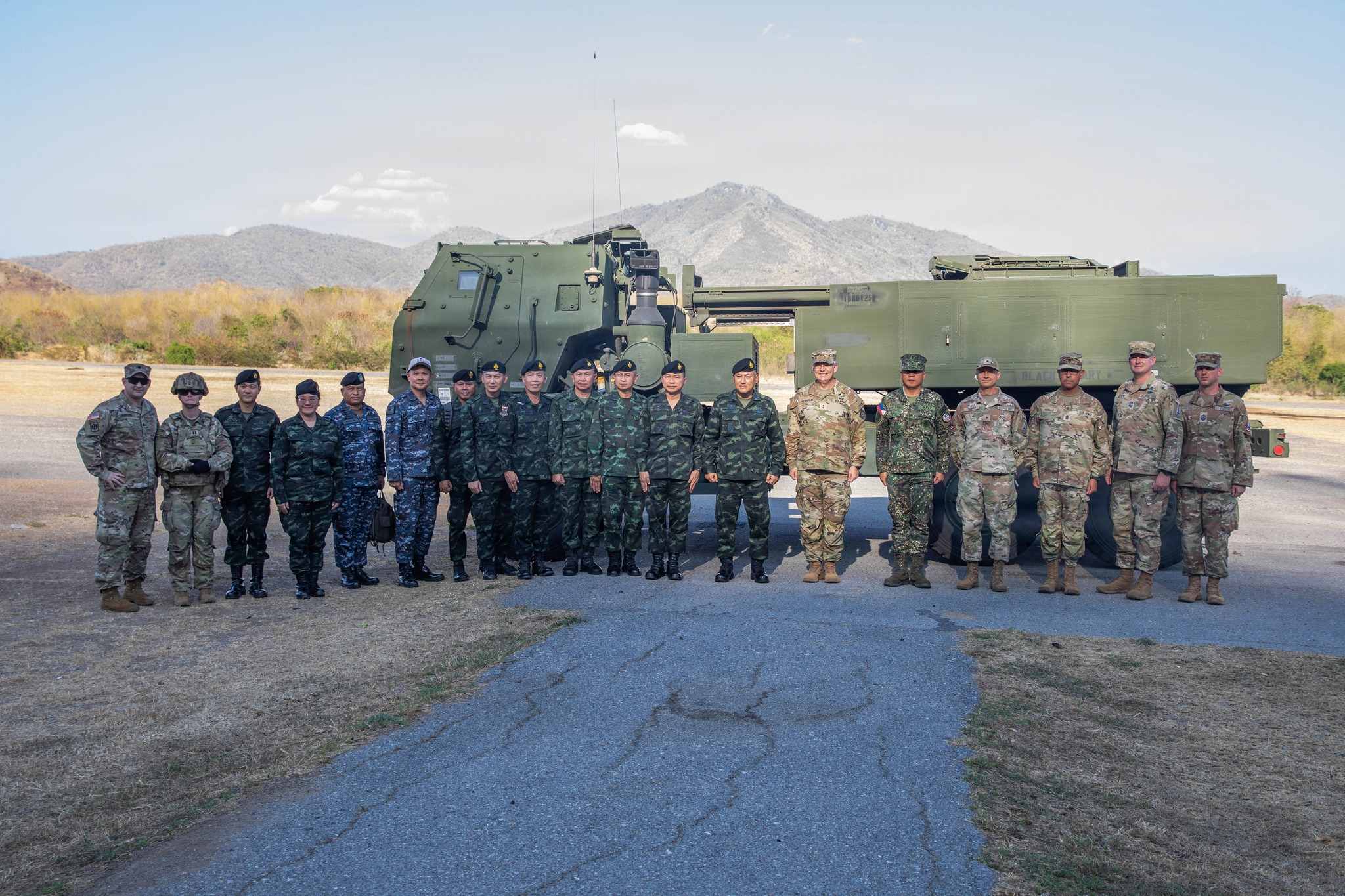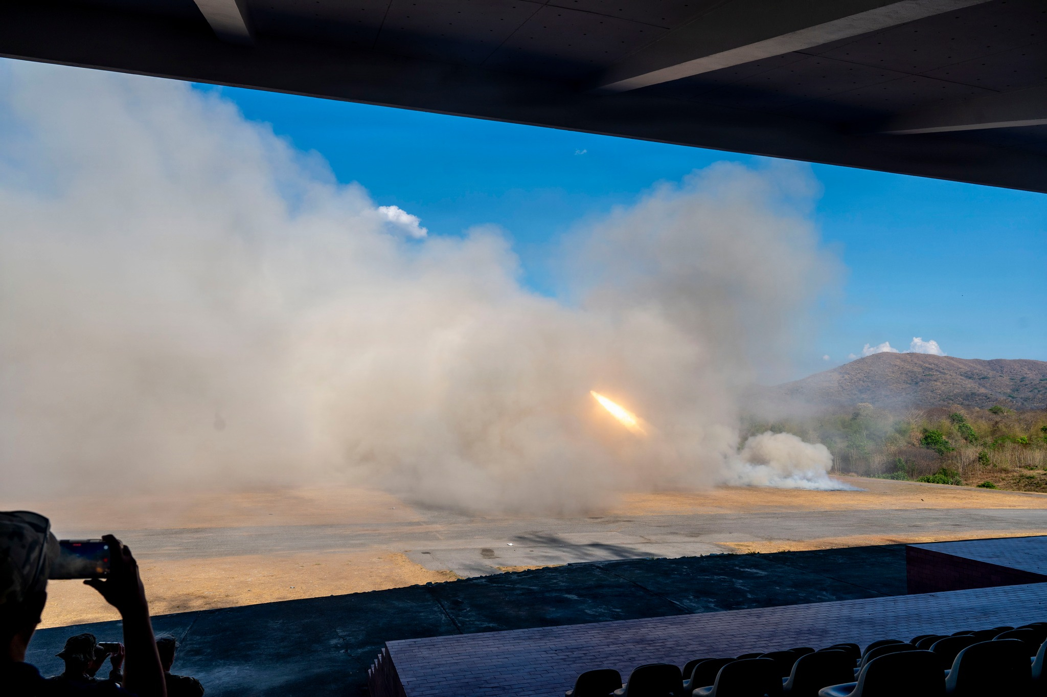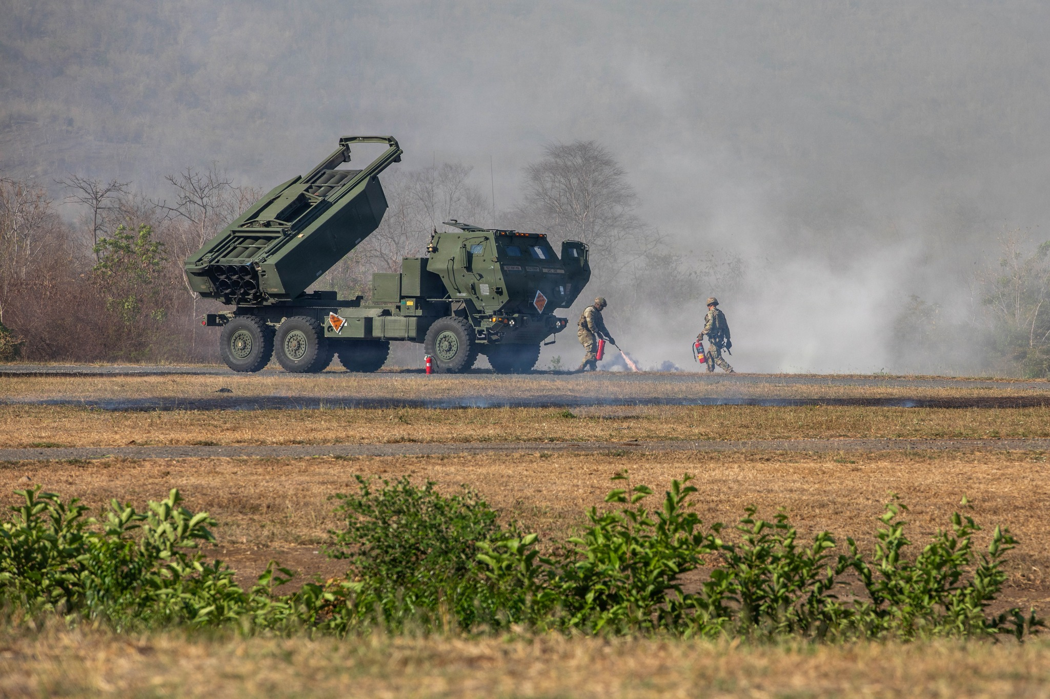 在泰国参加“2026金色眼镜蛇”联合演习的MD三等人“海马斯”火箭炮在射击的时候把场地上的草地点着了,美军不得不用灭火器灭火。