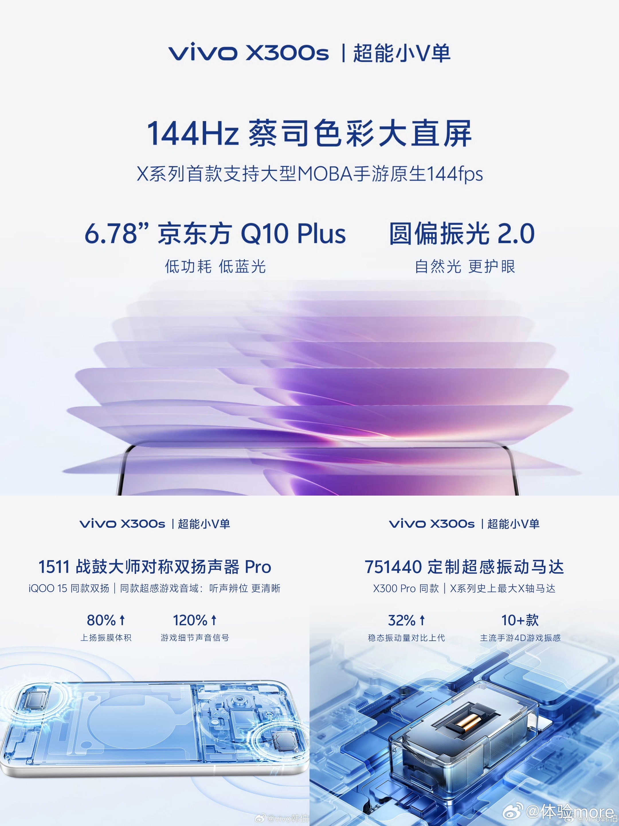 vivo X300s也预热了:6.78英寸144Hz 京东方Q10 Plus 四等窄直屏,1511对称双扬,751440马达。