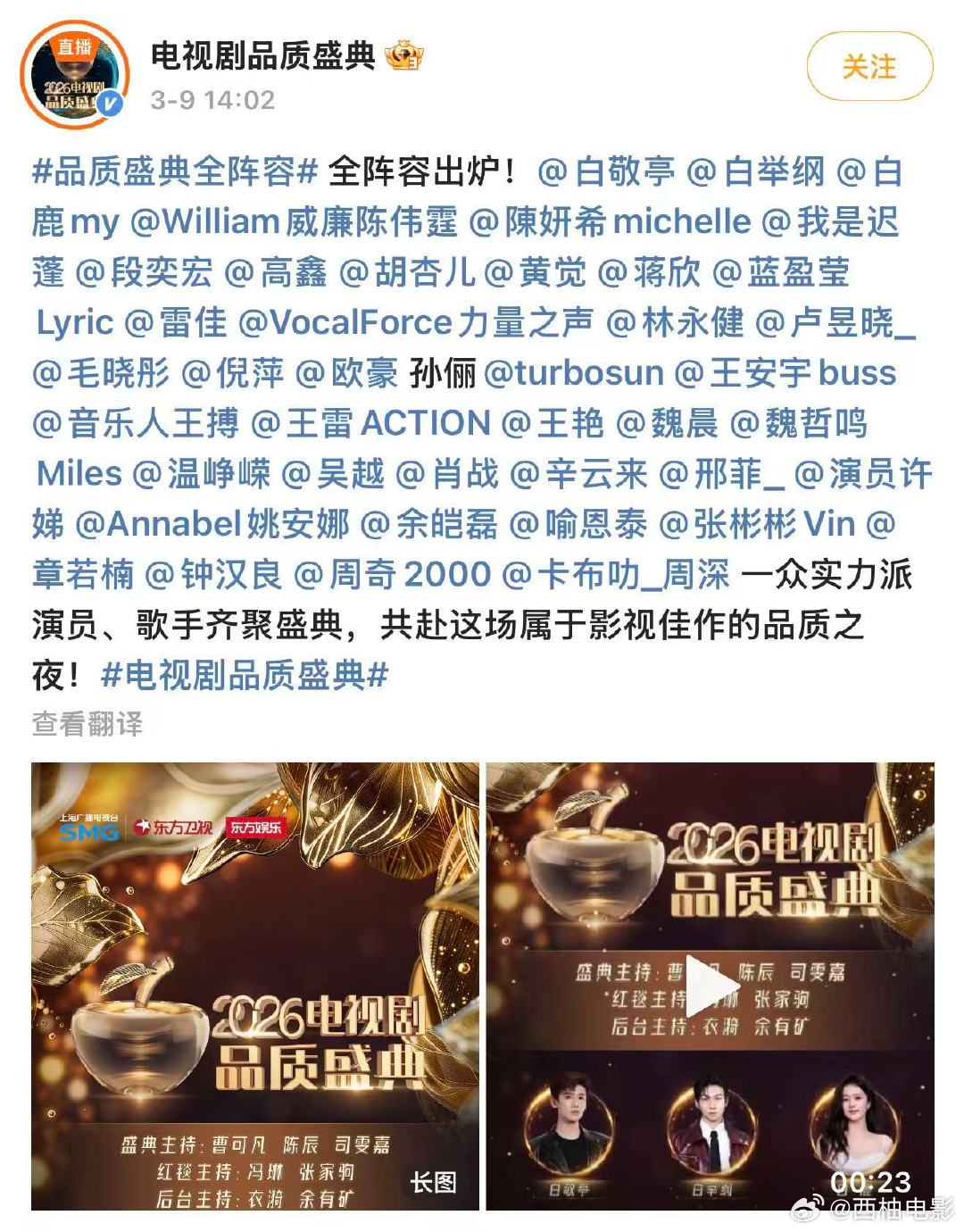 品质盛典全阵容官宣品质盛典全阵容出炉3月9日,2026电视剧品质盛典全阵容出炉