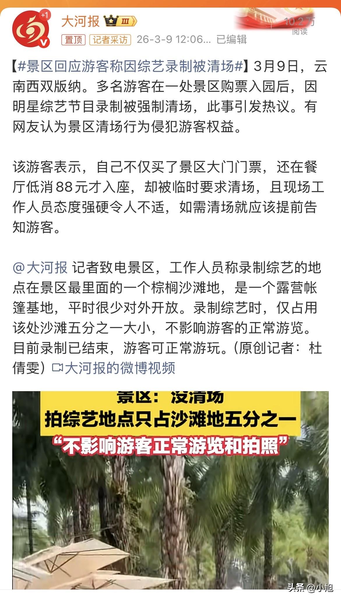 绝了!有个游客从外省飞了三千公里到西双版纳,景区门票买了,里面餐厅低消88元也花了,刚坐下准备歇口气,工作人员过来直接撵人——清场,要给综艺节目录制腾地方。 据后浪视频报道,这位游客当时气得不轻。她不是没花钱,大门票掏了,餐厅也消费了,结果屁股还没坐热,就被工作人员态度强硬地要求离开。最让她窝火的是,如果早知道有这档子事,她完全可以改天再来,或者去别的地方。可景区事前一点通知都没有 。 事情闹上网后,记者以消费者身份打电话去问景区。景区工作人员是这么回应的:录制已经结束了,现场就用围挡围了一小块地方,只占沙滩的五分之一,而且只占了十多分钟,不影响其他人游玩 。 但这话跟游客的体验对不上。游客被清场的地方是餐厅,不是那个沙滩。你说沙滩只占一小块不影响游览,可游客连餐厅都待不住,这叫不影响? 据大河报《看见》记者杜倩雯的报道,景区后来解释得更详细一些。工作人员说,录制综艺的地方在最里面的棕榈沙滩,那其实是个露营帐篷基地,平时本来就很少对外开放。这次录制只占了沙滩的五分之一大小,不影响游客正常游览 。 这里头有个词挺微妙:"平时很少对外开放"。既然是很少开放的地方,那游客正常情况下能进去吗?如果能进去,今天正好开放了,凭啥碰上录节目的就得让路?如果平时就不开放,那这个地方算不算游客花钱买的游览范围? 还有个细节值得琢磨。据台州晚报综合南昌晚报的报道,景区强调只占了十多分钟 。十多分钟,让游客坐着等一会儿不行吗?非得清场赶人?这里头无非两种可能:一是节目组要求高,不能有闲杂人等在场,怕路透怕干扰;二是工作人员懒省事,清场比协调来得简单粗暴。 但不管哪种可能,游客的感受只有一个:我的钱白花了,我的时间被浪费了,我还得看人脸色。花了钱还当孙子,换谁都得气。 其实这种事儿背后有个挺深的逻辑。景区接商业拍摄,能赚一笔场地费;节目组找到合适的外景地,能顺利录制。双赢。但赢的那两头,有没有想过游客?游客买票那一刻,跟景区之间就有个隐形合同:我给你钱,你让我好好逛。结果钱收了,服务半道被截胡,这不就是毁约吗? 有人说景区又不是不让进,就一小块地,别处还能逛。问题是,游客被清场的时候,工作人员有没有指个去处?有没有说句不好意思?有没有哪怕态度软一点?没有,就是硬赶。游客在意的往往不是那块地,是那个态度。 这事最后会怎么收场不知道。但有一点挺清楚:景区赚钱没错,但别把花钱的人当累赘。你让人家不舒服一次,人家就能让你难受一辈子——发个视频,写个差评,劝退一百个想来的人。这笔账,不知道景区算没算明白。