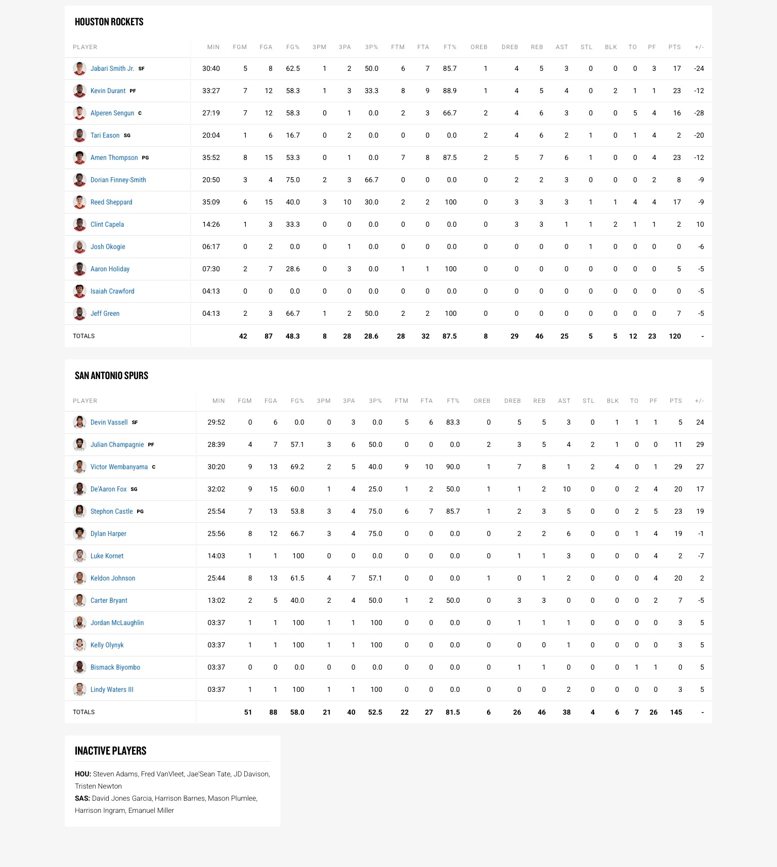火箭(39-24):阿门23分7板6助、杜兰特23分5板4助2帽、史密斯17分5板3助、谢泼德17分3板3助、申京16分6板3助、芬尼-史密斯8分2板3助、格林7分、霍勒迪5分、伊森2分6板2助、卡佩拉2分3板1助2帽