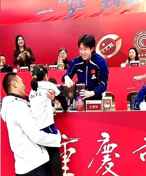 顶级的杀伐果断,破绽往往不到一米高。 重庆八中球馆里,9岁的戴意霖举起一幅拼图。 面对刚及胸口的女孩,1米85的王楚钦没有坐着敷衍。 他迅速起身屈膝,双手郑重接过,稳妥夹在臂弯。 随后他主动伸出右手,平视女孩,完成了三秒的握手。 连一旁的主教练王皓,也忍不住歪头笑看满脸羡慕。 看客调侃这是未来宠女魔王的预演,但这也是一种隐秘的心理投射。 一个从小缺乏普通娱乐时光的运动员,看到同样练球四年的小小背影,定会生出天然的疼惜。 在这残酷厮杀的竞技场外,他俯下身给出的这份极致温柔,究竟治愈了谁的童年?