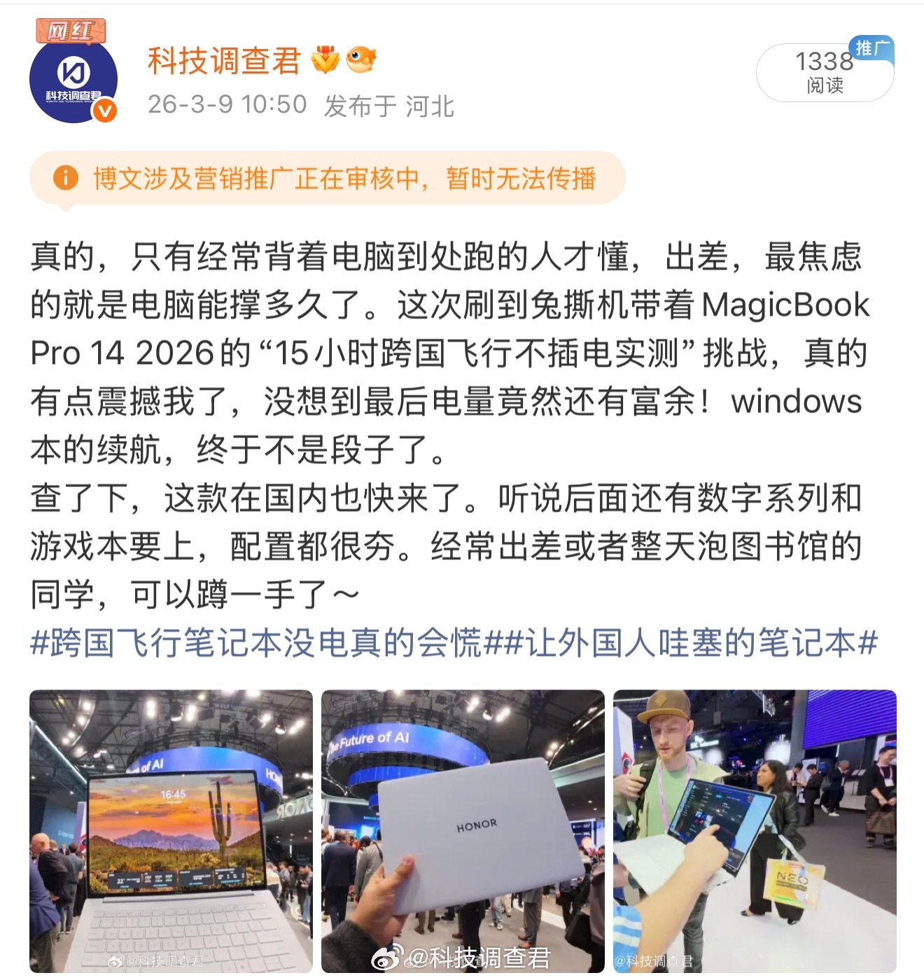前几天看到兔撕机带着MagicBook Pro 14 2026的“15小时跨国飞行不插电实测”挑战,真的有点震撼我了,没想到最后电量竟然还有富余!windows本的续航,终于不是段子了。