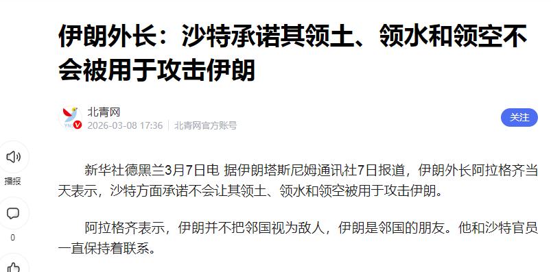 沙特倒戈,中东“起义”! 近日,伊朗外长阿拉格齐3月7日夜晚向外界透露,沙特已正式作出庄严承诺:绝不会允许其领土、领水和领空被用来攻击伊朗 。 不少网友说,这局面是要变天的节奏。怎么回事?这背后又有哪些看不见的手?今天咱就细细拆解。 有人可能还没完全反应过来,什么叫沙特“倒戈”?其实就是过去最铁杆的美国小伙伴,突然不肯再跟着美以步子,甚至直接表态和伊朗站到一边了。 这相当于球场上的主力前锋,在关键时刻开始给对面传球,这局势还怎么玩?中东乃至世界都在关注这个转变。 其实沙特作为区域大国,这次的操作既是无奈也是觉醒。 事情起因特别简单粗暴。美以联军最近直接把战火带到了伊朗家门口,甚至点名要让伊朗本土“见红”。 可以说,这种大规模军事打击是几十年来中东地区难得一见的硬刚。 按理说,美以打伊,沙特这些过去跟着美国一块打牌的,“站在美国战壕里”的,正常应该全力配合。 但事情突然180度大转弯,沙特不仅没动手,还发出了“不合作”警讯。很多人开始琢磨,沙特到底打的什么算盘? 首先我们得理清一个事实,美以这场“史诗怒火”,根本都没有征求过海湾国家的意见,简直就是美以拍着大腿自顾自上阵。 可偏偏,伊朗反应更猛,直接发起无人机和弹道导弹反击,目标明确,美军在海湾国家的各大基地,甚至有民用设施也被波及,阿联酋、卡塔尔、科威特这些国家都吃到了“溢出火花”。 更讽刺的是,这些国家还被美国冠名为“安全保护伞”下的亲密朋友,扪心自问,真遇到患难,美国人真能挡子弹? 结果明明白白摆在眼前,沙特首次体会到,所谓美国安全更多是一种“连坐”,外部风险瞬间放大。 有细心网友发现,一旦战争蔓延,沙特的航道、能源安全、国家发展全部都得受影响。 大家可以想象一下,沙特2030愿景正冲锋在前,吸引全球投资、打造世界级宜居城市、搞高科技,直接关系到国家现代化目标能不能实现。 可如今只要自己还愿意做美国的“棋子”,任何时候都可能变成伊朗的正当打击对象。 你觉得沙特会傻到一直替人背锅吗?这次事件让沙特决心跟过去“美国保安,沙特买单”的逻辑彻底说拜拜。 所以这一次,沙特政府的表态,可以说不是一时冲动,是深思熟虑之后给中东格局刷新的“实锤”。这份承诺特别有分量。 伊朗外长公开感谢沙特,沙特的信号也传递给了白宫。 其实在此前美以联军鼓动下,各大媒体还说沙特要对伊朗宣战,沙特立马辟谣,根本不想背锅。 做出的承诺也不是说说而已,这背后其实是一场大国战略调整:新形势之下,不做区域冲突的牺牲品,更不做美国的代理人战争棋子。 中东从来不是只属于大国博弈的“后花园”。 这一次的重磅转向,实际上见证了以沙特为代表的中东国家逐步走向成熟和自主。 过去几十年,美国为主导的“反伊联盟”借用区域国家作为跳板,沙特、卡塔尔、阿联酋都不得不接受“以基地换安全”的苛刻条件。 但用脚想都知道,这注定不是长久之计。 随着美伊矛盾白热化,伊朗策略也变得更直接——谁参与美以行动,谁就可能挨打。 沙特明显嗅到了危险。其实中东可是有前车之鉴的。 伊拉克、叙利亚、也门这些国家,无不是因为“卷进大国圈套”结果元气大伤。 让人没想到的是,沙特这次的决定,还和伊朗的双边关系“破冰”有关。 说白了,沙特和伊朗不是一天两天的宿敌,过去代理人战争打了好多年。 但去年中国促成的两国复交,直接冰释前嫌。 要不是“史诗怒火”这事,也许双方还是按部就班发展关系。 现在沙特表态要当“好邻居”,等于加速双方关系升温。 伊朗也主动示好,承诺只要邻国不参与攻击,绝不会主动动手,还专程向周边国家“致歉”,效果比盟国的口头安慰强多了。 这一系列的操作让美国有点尴尬。 美国高层还在打击伊朗的战鼓雷动,诸如防长扬言要增大火力,特朗普也在镜头前表态“要伊朗无条件投降”,可真正付诸行动的时候,盟友都在思考自身利益和未来。 沙特这颗“多米诺骨牌”一倒,阿曼、卡塔尔等国家大概率也会跟进,和伊朗相互达成“互不侵犯”这种君子协定。 更何况,当前全球形势正在发生深刻变化,谁还愿意老是替美国擦屁股? 如果说沙特倒戈是偶然,那就太小觑了中东国家的战略觉醒。 归根到底,沙特真正看透了美以的意图。一旦伊朗倒下,沙特永远将是下一个成为美国“推前线”的对象。 以往那种寄希望美国“管控风险、保国家安全”的时代已经过去了。 参考:北青网——伊朗外长:沙特承诺其领土、领水和领空不会被用于攻击伊朗