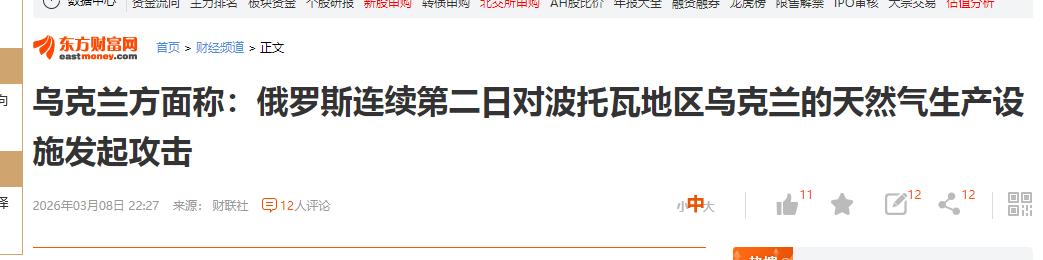 乌克兰传来新消息! 2026年3月8日晚,乌克兰发布消息说:俄罗斯军队连续第二天轰炸了波托瓦地区的乌克兰天然气生产设施。 什么叫冬天刚要过去,但这个冬天突然加了BUFF?乌克兰老百姓夜间零下,楼里暖气说断就断,直接把人打回“暖手宝也救不了的天”了。 前线没那么热闹,大后方却被炸得鸡飞狗跳,真的,战争从来都不是只在前线玩的游戏,全社会都得陪跑。 咱今天不整啥高深难度,也不是“国际政论专家”解读。 咱就用大家一刷就能懂的方式,聊聊这波俄军打击,到底拍碎了乌克兰哪些“防御盾牌”,让欧洲跟着“发抖”? 而且,这场轰炸背后暴露出的那些真问题,甚至对我国一些国际能源贸易判断其实有个大启发。 记得最重要的一句话:拦截率再高,少量漏网的目标,依然能把能源网打成筛子! 先说说背景,这波轰炸,真的不是“惯例”操作。大家想想,就在被炸前48小时,泽连斯基办公室还在跟欧洲“抓紧谈判”,试图拉回乌克兰天然气过境那条生路。 冬天眼看着能源消费压力最大,何况是零下夜晚,乌克兰本来以为能熬完这个冬,“能源休战”小日子还能继续过。 不成想,俄军突然开大,直接把协议框出来谈的事一炮轰碎,波尔塔瓦的气田设备、储气罐、维修铁路统统成了“陡然失守”的焦点。 更夸张的是,这已经是乌能源系统今年的第五次大规模遇袭。 数据直接铺出来——俄军动用了29枚导弹,还有480架无人机。 看到这个数字其实都不太敢信,乌克兰工业核心区,变成了导弹和无人机集火区。 波尔塔瓦这次,能源设施一片暂停,乌克兰7个地区连夜拉闸断电,基辅2700栋居民楼直接“停暖营业”。 这种级别的袭击,连欧洲评论员都心头一紧。 而对我们来说,这戏码太有启示:冲突形式在变,但核心目标不变——“掐住喉咙式消耗”,比摊开硬拼还可怕。 朋友们可能要问,这俄军怎么转性了,不是一直追着前线推吗? 这次怎么突然瞄准了非前线的能源区?其实俄罗斯对战术的调整非常明显。这波操作直接把“体系化作战”玩到极致。 你看,以前俄军更多是地面推进,现在则是全平台联动,海上的“口径”巡航导弹、陆基的“伊斯坎德尔”、还有空基的X-101,同时出动,从多点包抄。 先把雷达站拆掉,等于给乌克兰“摘了眼镜”,然后再精确锁定储气罐,最后连专门维修设备的铁路运输链路也一并端掉。 这样的打击链条,不就是一步步把对手的防守空间收紧到极致吗? 明面上攻击的是民用能源设施,但俄方有个明确立场,这些设施其实就是保障乌军供给的“军用设施”,打掉有它的“法理支持”。 简单点说,前线看不到能源流,后方自然主战场。 很多人觉得战争就靠拼武器,实际,真正的较量在于谁能打断对方的“大动脉”。 咱们回头看乌克兰这边应对,实际上困境远比外面想的要难。 泽连斯基连番喊话,说防空系统强大,这一波一共击落了453架无人机,算下来拦截率高达87%。 听起来数据很美丽,但是你看实际结果,那27架“漏网之鱼”精准命中了天然气管道,变电站等核心能源设施,直接让乌克兰大面积停产限电。 乌的防空系统,已经倾尽全力,但只要有极少数的目标被突破,整个能源网依然一击即溃。 为什么会这么严重?说到底,乌能源基础设施本来就“脆皮”。 别说俄军压着打,哪怕在“和平时期”,冬天里能源都很紧张。 俄乌冲突让这些设施变成彩色靶子,只要保卫链条上有一处疏漏,大量无人机和导弹就能再度把关键点一波带走。 换句话说,攻击方的数量优势、技术优势、库存和产能优势叠起来,守方拦得住一百,也扛不下那一二十。 这些破坏让人直观感受到,战争从来不是前线和后方的分界线那么清晰。 哈尔科夫有居民楼被炸,直接有人被埋。 夜间零下,很多家庭一断暖气,孩子和老人直接挤在厚棉被里熬夜。 7个地区接连拉闸,每到晚上窗外大片黑漆漆的风景,网络上一堆博主发“家里冷得能哈出白气”,让人一瞬间明白何谓抽掉民生保障。 实际上,没有暖气和电,不只是生活不便,整个城市运转、工业生产和居民节奏全都陷入基本停摆。 越是后方的人,越是直观体会到这场战争的残酷,它已经渗进每个人的生活里头了。 其实,这波轰炸更深一层的意图也很明显。 先看经济层面,乌克兰向欧洲出口天然气、赚外汇、买装备,本来靠的是油气这条大动脉。 如果气田、管道和配套全废了,乌克兰不仅无法和欧洲谈“天然气过境”,更别提用能源外汇置换军事物资,这种“釜底抽薪”的打法,才是俄军这次行动的深层逻辑。 实际上一旦能源生产能力被摧毁,乌克兰在国际能源话语权也在下降,欧洲也等于“被绑在一辆动车上急刹车”。 参考: 东方财富网——乌克兰方面称:俄罗斯连续第二日对波托瓦地区乌克兰的天然气生产...