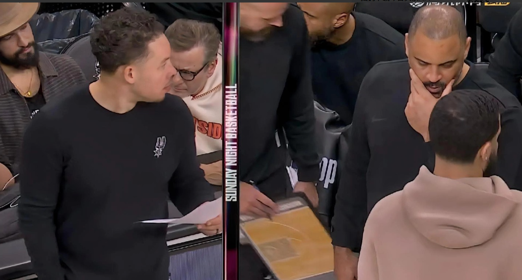 这是第三节的中段,马刺一波24-10后,把比赛打花了,打得火箭几乎没有心气了,安全招架不住马刺的狂轰滥炸,马刺最多领先到了27分,然后镜头把乌度卡和米奇框在一起,只见乌度卡连战术板都没拿,他在向范弗里特求教,范乔丹一顿给他建议。