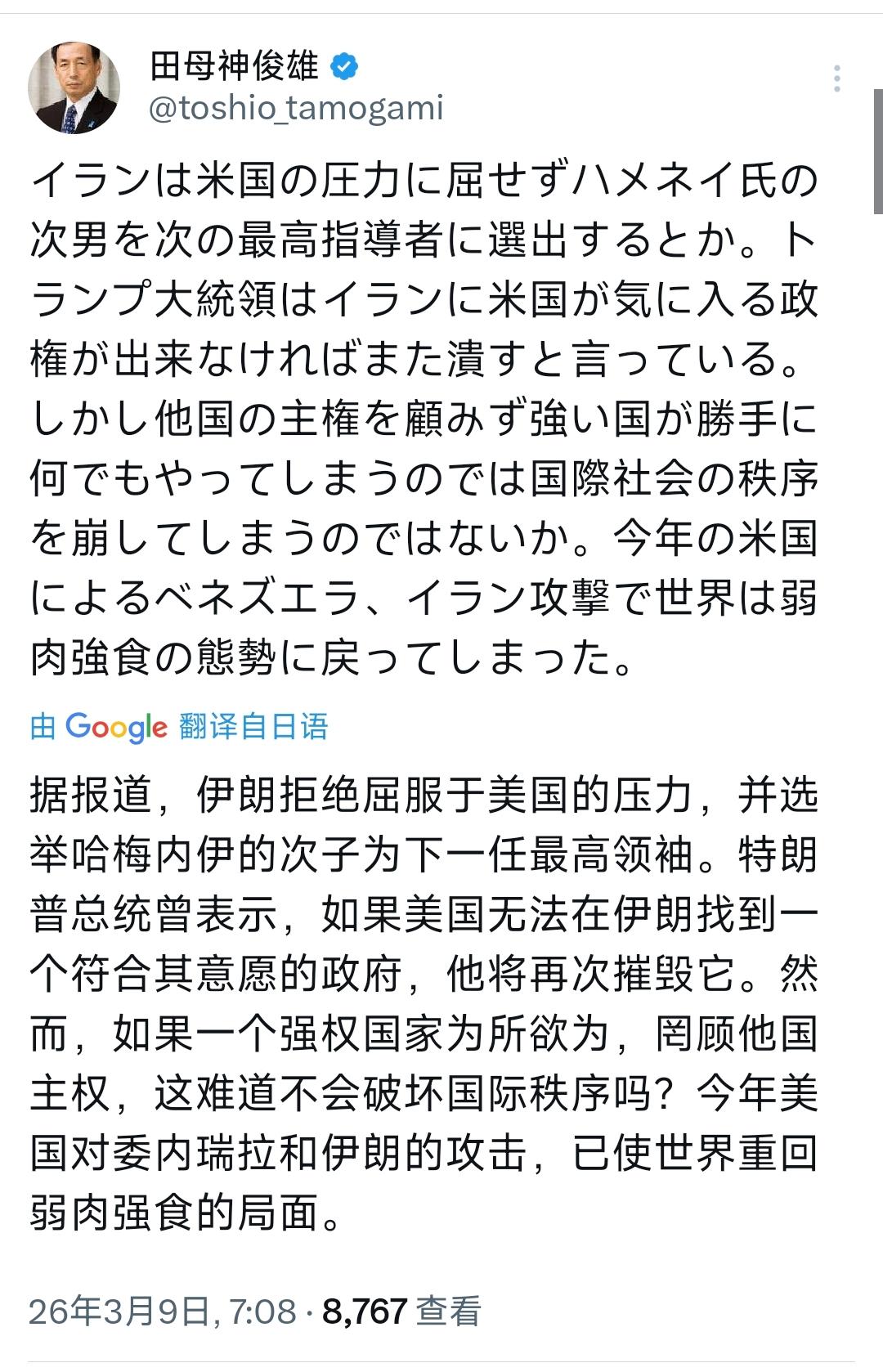 来,咱们今天就聊个新鲜事,估计你刷到现在还没见人认真分析:日本有位名气不小的极右翼大佬、前航空自卫队幕僚长田母神俊雄,最近又发声了。 这哥们看起来是以批美著称的老角色,这次盯上了刚刚发生的中东大事。 他一边评点伊朗的最新政治风波,一边把美国最新动作怼了个通透,还把批评嘴炮瞄准了美国霸权思维。 这动作其实不仅局限于他个人,其实能折射出盟友圈内部越来越多的矛盾。 那句大白话先放在这里:有时候说实话的人,没准反倒来自我们认为最意想不到的“奇葩”阵营。 现在把大家注意力拉回伊朗。 最近,伊朗在全球都敏感的氛围下选举了哈梅内伊的次子穆杰塔巴・哈梅内伊作为新任最高领袖。 这事本身就挺引人关注,要知道这段时间伊朗可一直被美国紧盯着。 美国方面,不甘心伊朗在没有美方认可的情况下选出新领袖,特朗普更是放话:若伊朗新政府不顺美方意,美国将不惜武力摧毁。 记住,这可不是嘴上说说,刚刚2026年,美国实际就对委内瑞拉和伊朗采取了军事冲突行动。 这就是典型的强权霸凌,不仅让伊朗民众人人自危,更是在全世界范围挑动了更强烈的不满。 伊朗这次顶住压力、坚持自主,给全世界上了一课:并不是所有国家都得靠美国点头才能做决定。 田母神俊雄围绕这波中东动荡讲的观点很有意思,他说出了许多人心里的话。 以往光看他那日常操作,会觉得他是对外极端强硬的“民族主义者”代表,但这次,他的炮口对准了美国,说美方大国无视他国主权,会让全世界再次陷入丛林法则的混乱时代。 他直接指出美国对伊朗、委内瑞拉的连环军事行动根本是在践踏国际法。 他并没有否认伊朗、委内瑞拉各自存在的复杂矛盾,但更强调美方这种仗着实力随意干涉别国内政,是对国际秩序和基本规则的公然破坏。 “世界曾多少次因为大国恃强凌弱走到悬崖边,现在美国这种做法又让大家看到何谓霸权本色”,田母神俊雄的这些话虽然源自日本自己的右翼视角,可意外地击中了不少人的共鸣点。 回看田母神俊雄的背景,这哥们可不是一般政客。 作为日本极端右翼的代表,他一直鼓吹“旧日本荣光”那一套,哪怕国内外都对日本历史认识有争议,他依旧不改强国论调。 他呼吁恢复日本“自信”,主张军力自立。 在许多日本民粹派、极端保守圈里,他简直类似于精神导师一般的存在。 而在对外立场上,他采取既反美又反华的强硬姿态。这一点在他以往对台湾地区、对我国的各种声音中表现得非常直接。 不过这次他对美国的痛批,反倒和世界不少国家、特别是我国的许多网民有了交集。 毕竟,美国这些年甩脸色、搞制裁的事情,全球早已目睹,类似剧本屡屡上演,已经让大家意识到谁是这个星球最大的搅局者。 不得不说,田母神俊雄这番点破美国的发言,逻辑上其实没啥毛病。 他在分析美国行动危害时,用词直白,不拐弯抹角。 他痛批特朗普直接威胁伊朗政府,公开对两国实施军事攻击,等于让“丛林法则”升级回归。 这句话用在当下再合适不过。 他还强调,这种无视主权和国际法的做法,终会让国际秩序更加混乱。 但这里要插一句,虽然田母神俊雄自身立场强烈、带有自己的右翼色彩,可不可否认他的某些分析站在全球更普遍的法律、道义标准之上,不仅没走极端,倒客观还原了真实的国际关系图景。 对于我国受众来说,这种观点其实反而有借鉴意义。 中国一直强调国际法、强调平等、尊重主权,拒绝单边霸权。 在这样的逻辑下,美国这套“有用就用,无用就毁”的双重标准,自然越来越没有市场。 说回到美国,为什么全世界越来越多声音不买账? 这些年,大家亲眼见识到了美国对待“盟友”和“对手”的两张脸:对眼中钉就是技术、经济、甚至直接军事极限施压,对盟友需求极致捆绑。 可就连不少本该铁杆的盟友阵营,如今内部也闹起了分歧。 田母神俊雄的发声,归根到底,也是对美国这种霸权行为的抗议,更反映了日本与美国的深层次矛盾。 自二战后日本长期被“军事禁锢”,暗地里其实怨气很深。 这一回,田母神俊雄敢于大声把美国的霸凌行径直接抖落出来,无疑给了一线盟友国家更多反思的空间。 实际上,国际社会早已对美国单边主义和强权政治提出一波又一波质疑声。 委内瑞拉、伊朗面对美国压力时都曾试图通过外交、经济合作“活下去”,而美国始终用硬实力制裁和军事打击解决分歧。 这种模式本就无法持久。 参考 : 极目新闻——哈梅内伊次子“冒死”接班,伊朗为何一定要选出最高领袖?