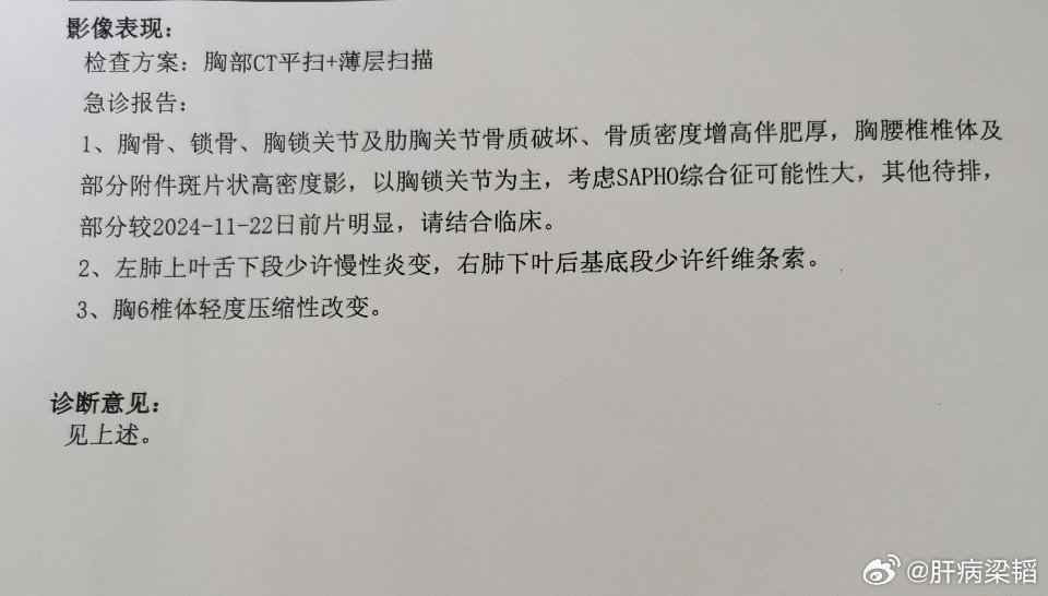 SAPHO综合征(滑膜炎-痤疮-脓疱病-骨肥厚-骨炎)定义:罕见慢性自身炎症性疾病,核心是皮肤+骨关节同时受累。一、核心表现(5个字母对应)S(Synovitis)滑膜炎:关节肿痛、压痛,潮湿寒冷加重A(Acne)痤疮:面部/上背部重度聚合性/暴发性痤疮P(Pustulosis)脓疱病:掌跖脓疱病(手足脓疱、脱屑)最典型H(Hyperostosis)骨肥厚:骨质增生、硬化O(Osteitis)骨炎:无菌性骨炎,前胸壁(胸锁/胸肋关节)最常见,呈对称性肿痛二、临床要点好发:成人40–60岁,女性略多骨受累:前胸壁(典型“牛头征”)、脊柱、骶髂、长骨干骺端皮肤:掌跖脓疱、重度痤疮、化脓性汗腺炎实验室:ESR/CRP可升高;RF、ANA多阴性影像:骨扫描“牛头征”;CT/MRI见骨硬化、肥厚、水肿三、诊断(Kahn标准,满足1条+排除肿瘤/感染)1. 骨/关节炎 + 掌跖脓疱病2. 骨/关节炎 + 重度痤疮3. 成人孤立无菌性骨肥厚/骨炎4. 儿童慢性复发性多灶性骨髓炎5. 骨/关节炎 + 炎症性肠病四、治疗(阶梯式,对症+抗炎)1. 一线:NSAIDs(止痛抗炎)2. 二线:双膦酸盐(静脉,改善骨痛) 激素(短期,避免长期)传统DMARDs(甲氨蝶呤、硫唑嘌呤等)3. 三线:生物制剂(TNF-α抑制剂、IL-1/IL-17拮抗剂、JAK抑制剂)4. 局部:外用激素、维A酸(皮肤)五、预后慢性、反复发作;正规治疗后总体良好,极少危及生命。