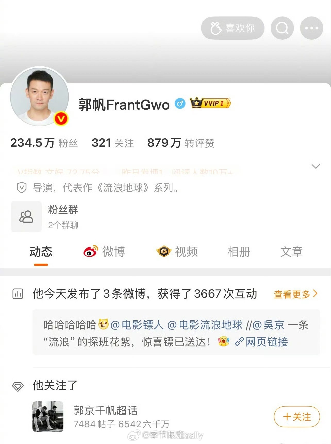 我真的要笑死了郭帆关注了他和吴京的cp超话