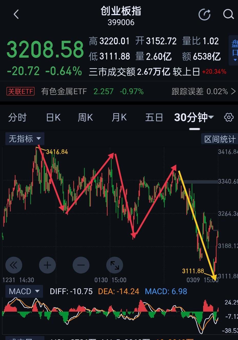 创业板,受外围环境影响,盘中快速回落,上周的日线底分型被迅速破坏。 创业板目前的走势依然是围绕图(1)一分钟中枢的震荡延续。明天的操作,可根据围绕该中枢形成的三买或三卖,做出有效应对。 就目前结构,判断阶段性反转的条件尚不成熟。(图中黄色箭头属于待完成走势)