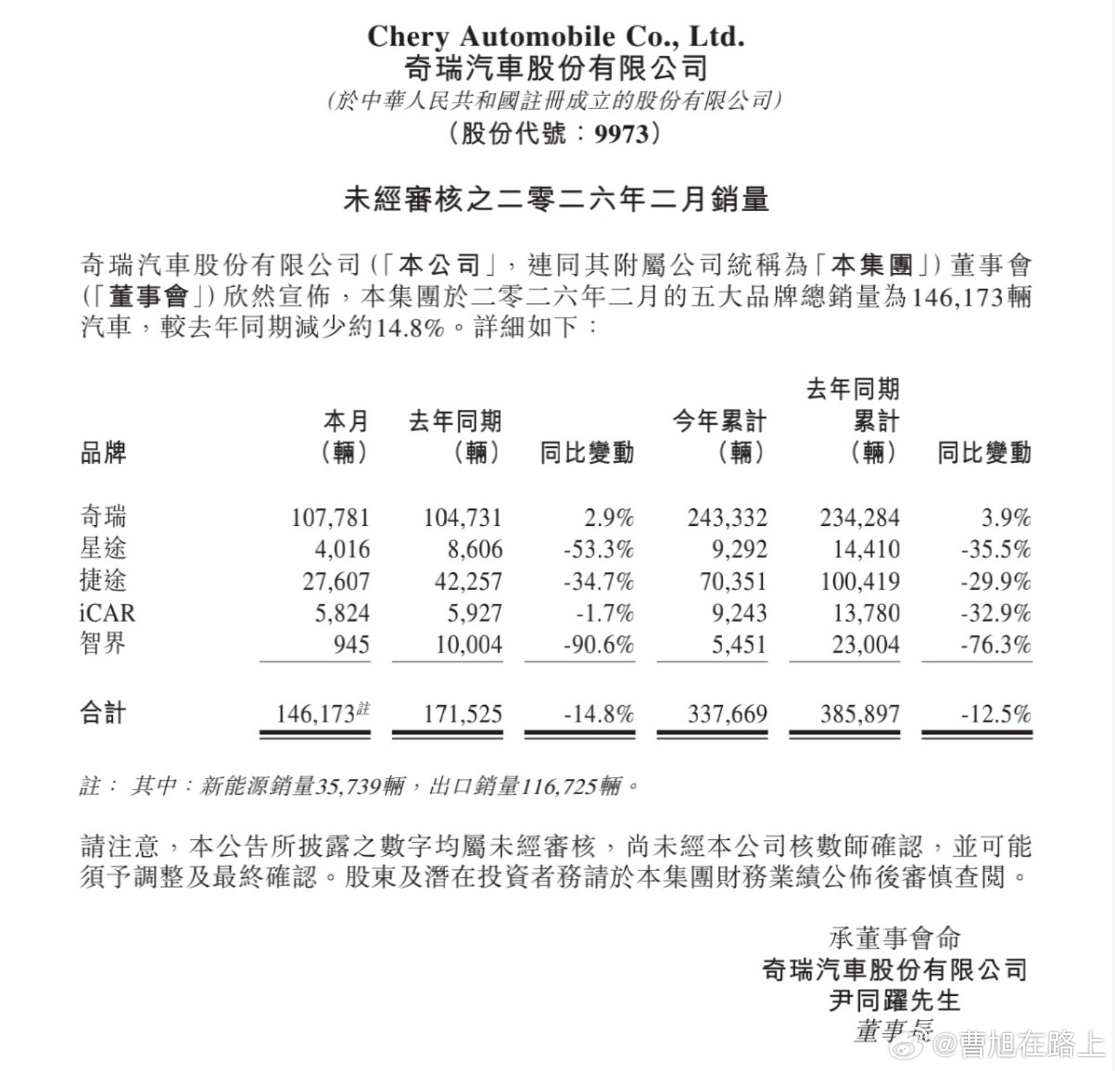 这是奇瑞汽车股份有限公司(港股代码:9973)发布截至3月1日的2026 年 2 月销量数据公告,核心披露集团旗下五大品牌的月度及累计销量表现,能够看出:2 月总销量:146,173 辆,较去年同期(171,525 辆)同比下滑 14.8%1-2 月累计销量:337,669 辆,较去年同期(385,897 辆)同比下滑 12.5%,整体开局承压新能源销量:2 月新能源车型销量 35,739 辆,占总销量约 24.4%(35739/146173)出口销量:2 月出口 116,725 辆,占总销量约79.8%(116725/146173),出口是奇瑞销量的核心支撑力量任重道远,今年的新车市场竞争依然是激烈震荡变数颇多,中国品牌继续加油加电新能源汽车 新能源大牛说