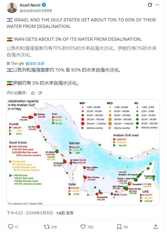 巴林最担心的事情还是发生了,伊朗发起报复攻击了巴林的海水淡化厂!美国和以色列脑袋一定是秀逗了,竟然主动攻击伊朗的海水淡化厂,要知道伊朗对海水淡化依赖程度是0.2%,而海湾国家最低的阿联酋都是42%,最高的科威特竟然高达90%,如果伊朗对等报复,整个中东都会被渴死! 几天前说起,美国和以色列主动对伊朗发动了军事打击,其中一个目标就是伊朗格什姆岛的海水淡化厂,美军用战术弹道导弹精准击中了这座水厂,把它彻底摧毁了,导致岛上15万居民和周边30个村庄一下子就断水了。 美以当时还挺得意,觉得这样既能警告伊朗,又能通过切断民生水源,让伊朗民众失去抵抗意志,以为是一举两得的好办法。 可他们压根没好好想想,伊朗和海湾国家的情况完全不一样,攻击海水淡化厂,对伊朗来说影响微乎其微,反而会引火烧身。 伊朗对海水淡化的依赖程度特别低,全国范围内也就0.2%,而且这些海水淡化厂大多集中在南部沿海和岛屿这些边缘地区,根本不影响全国的供水。 伊朗的主要水源还是靠大坝、地下水和地表水,就算格什姆岛的海水淡化厂被摧毁了,全国的供水体系也一点事没有,老百姓的正常生活不会受到太大影响。 可海湾国家就完全不同了,中东地区本身就是全球最干旱的地方之一,自然淡水资源特别少,地下水也快被开采完了,海湾国家的老百姓要喝水、生活,几乎全靠海水淡化厂。 这里面,依赖度最低的阿联酋都达到了42%,也就是说,阿联酋差不多一半的饮用水都来自海水淡化;而科威特的依赖度最高,竟然达到了90%,几乎所有的饮用水和生活用水都要靠海水淡化厂供应。 除了这两个国家,沙特的依赖度也有70%,阿曼86%,以色列自己也有75%的饮用水依赖海水淡化,巴林作为海湾国家之一,对海水淡化的依赖也很高,所以他们一直特别担心伊朗会报复,攻击他们的海水淡化厂,现在这份担心真的变成了现实。 美国中情局早就有过分析,海湾国家90%以上的淡化水都集中在56座大型水厂,这些水厂都是关键的基础设施,特别容易受到军事攻击,一旦被击中,周边的城市几天内就会陷入瘫痪,连基本的生活都维持不下去。 历史上也有过这样的先例,海湾战争后期,伊拉克从科威特撤退时,就破坏了科威特的大量电站和水厂,导致科威特战后很多年都处于缺水状态,只能靠进口水维持。 伊朗这次的报复,完全是美以逼出来的,伊朗外长早就警告过,是美国开启了攻击民用设施的先例,伊朗只是以其人之道还治其人之身。 自从2月28日冲突爆发以来,巴林的防空系统已经拦截了伊朗发射的92枚导弹和151架无人机,可见伊朗的反击力度一直很大,而这次攻击巴林的海水淡化厂,就是最直接的报复。 现在的情况越来越危险,除了巴林,阿联酋和科威特的多座海水淡化厂也已经受到了战火波及,科威特还启动了防空系统,拦截了多枚导弹和无人机,卡塔尔也拦截了一枚伊朗发射的导弹,整个海湾地区都陷入了恐慌。 海水淡化厂的核心设备特别精密,一旦受损,抢修起来至少需要半个月以上,而海湾地区日均气温很高,要是断水时间长了,老百姓根本没法生活,更别说维持社会稳定了。 美国和以色列这次是真的失算了,他们只想着打压伊朗,却忘了自己的盟友全都是靠海水淡化生存的,攻击伊朗的海水淡化厂,无疑是把自己的盟友推向了危险的边缘。 现在海湾国家的处境特别尴尬,一方面要依赖美国的军事保护,另一方面又不得不直面伊朗的报复和缺水危机,甚至有些国家已经开始不满美国的做法,觉得是美国把他们拖入了这场灾难。 更关键的是,伊朗的反击还在继续,伊朗总统已经明确表示,美以越施压,伊朗的回应就会越强烈。 如果伊朗持续对海湾国家的海水淡化厂发动攻击,后果不堪设想,科威特90%的用水靠淡化,一旦水厂全部受损,整个国家都会陷入断水危机; 阿联酋、沙特也会跟着出现严重缺水,到时候整个中东地区都会因为缺水陷入混乱,真的有可能像你说的那样,整个中东都会被渴死。 说到底,这件事的根源就是美国和以色列的鲁莽行为,他们太过于自信,以为凭借军事优势就能随意打压伊朗,却忽视了海湾国家的致命软肋,也低估了伊朗的反击决心。 现在巴林的海水淡化厂已经受损,海湾国家的恐慌还在蔓延,要是美以不及时停止挑衅,这场危机只会越来越严重,最终受伤的还是整个中东地区的老百姓。