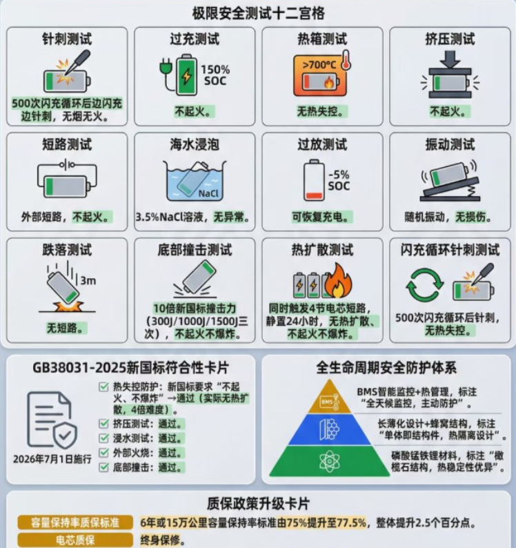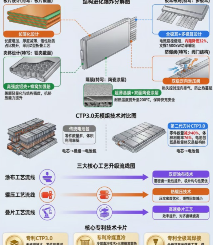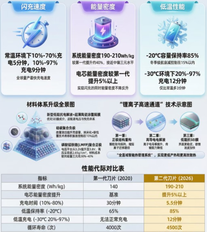 ①比亚迪第二代刀片电池采用磷酸锰铁锂(LMFP)复合正极搭配硅碳负极的全新材料体系,经过专项改良后的磷酸锰铁锂,成功突破动力电池“能量密度、安全、快充” ②该材料在继承初代磷酸铁锂“针刺不起火”安全基因的基础上,通过添加锰元素优化,将电压平台从3.2V提升至3.8V,系统能量密度达190-210Wh/kg,较初代提升35%以上,同时为大倍率快充奠定了核心基础。