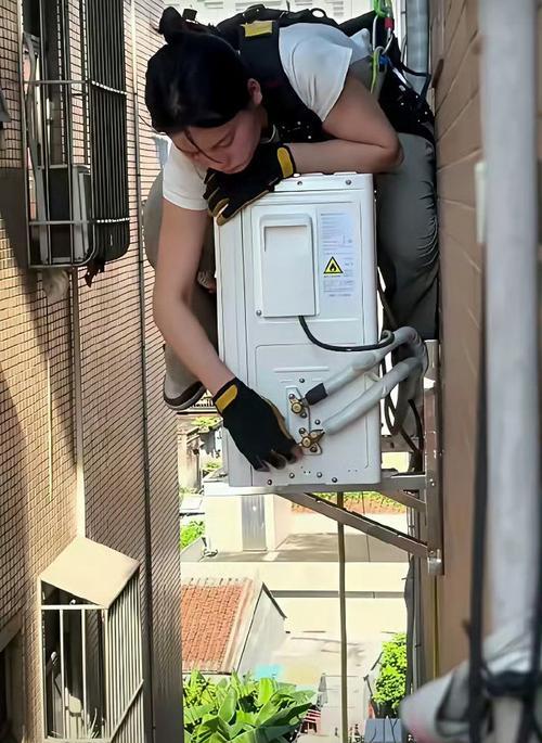 火上人民日报了!广东一男子买了空调,来安装的是一对二十多岁的年轻夫妻。可他万万没想到!女的一上来就绑上绳子就爬到窗外,钻孔、装支架,整个过程无比熟练。 门刚打开时,业主还以为自己看错了。 来的人不像常年在外奔波的师傅,更像刚毕业不久的小两口,背着工具包,神情安静。 他原本认定,高空装外机一定是男人的活,女孩子顶多在屋里递工具。 结果安装方案刚确认完,女孩已经把安全绳绕过承重位置,卡扣逐个检查,又用力回拽试拉。 丈夫把另一端固定好,手一直握着绳索源头。 窗外是十几层的高度,阳光直晒外墙,金属机位被烤得发烫。 她翻出窗框时动作干净,没有多余停顿。 一只手扶墙,一只手举起电钻,钻头咬进混凝土,粉尘往下掉,她抬袖擦了擦脸继续操作。 打孔、上膨胀螺丝、装支架,再把三十多公斤的外机一点点托到位。 屋里的人全程站在旁边,水都忘了喝。 丈夫不时递工具、接铜管、拉紧绳索,两个人几乎不用说话,配合却是天衣无缝。 很多人不知道,空调安装属于特种高空作业,超过两米就要持证。 夏季旺季来临,一天七八单是常态,清晨出门,深夜收工,辗转多个小区。 外机旁的环境温度常常接近五十度,衣服十几分钟就湿透。 她手臂上有被碎屑划破留下的痕迹,小腿上还有搬运机器留下的淤青。 干这行三年多,她从最初不敢往下看,到能独立完成整套流程,用了大半年时间练习。 丈夫当年在后面一点点教她卸力,教她判断受力点。 后来形成现在的分工,她体重轻,身手灵活,适合站在窄机位上操作。 他在室内负责绳索和内机调试,配合更安全。 为了节省人工成本,他们没有再请帮手,多干一单,收入就多一份。 孩子留在老家,由老人照看,小两口盘算着攒钱,把孩子接到身边,再买一套小房子。 行业报告显示,空调安装从业者里女性比例不到百分之五,能独立完成高空作业的更少。 偏见常常比高空更难跨过去。 有客户起初质疑她行不行,装完后又主动留下联系方式。 机器试运行时,冷气很快充满房间。 她收拾碎屑,把废料打包,背起几十斤的工具箱准备赶下一单。 业主递上水,心里五味杂陈。 这段视频被上传到网络,迅速传播开来。 不少人惊讶,也有人开始关心这个行业的安全保障。 高空作业大多依赖单绳保护,小团队的防护条件并不算完善。 高温补贴、系统培训,在一些基层环节还需要加强。 城市里越来越多的高层住宅,把空调机位留在室外,也把风险交给安装工。 很多人只关心安装费高不高,很少想过外墙上那一小时意味着什么。 这对年轻夫妻没有多说什么,干完活就离开。 他们的生活没有戏剧化桥段,只是日复一日把螺丝拧紧,把机器装好。 等到夜里回到住处,第二天的订单已经排满。 空调送来清凉,窗外的人继续奔波。 看见他们的身影,也许能多一份理解。