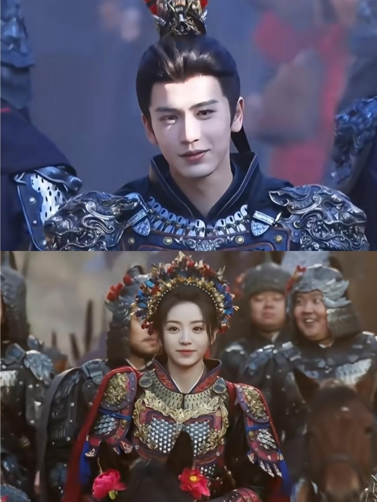 《逐玉》凯旋妆造❗张凌赫的雉翎冠,田曦薇女帅盔,到底谁设计的?酷毙了! 张凌赫饰演的谢征,头戴雉翎冠,两根修长的雉鸡翎羽高高竖起,红黑相间的束带格外醒目,被网友调侃像齐天大圣,自带英武霸气。 他身着一套以黑银铠甲,肩甲与胸甲上錾刻着繁复的龙纹与云纹,冷冽的金属光泽与他意气风发的神态相得益彰,尽显少年将军的桀骜与锐气! 田曦薇饰演的樊长玉,则是另一种巾帼风采。她头戴色彩斑斓的凤冠,红、蓝、金三色珠翠交相辉映,华丽又不失英气。 身上的铠甲以红金为主色调,银白的甲片如鱼鳞般细密,胸口的金色兽面纹霸气十足,再配上肩头的红色披风,将女将的飒爽与柔美完美融合。 两套造型一刚一柔,黑银重甲的凛冽与红金凤冠的明艳形成强烈呼应,既贴合角色身份,又将“凯旋而归”的豪情与宿命感拉满。 就想问一句,这两套妆造哪个设计师设计的,酷毙了!
