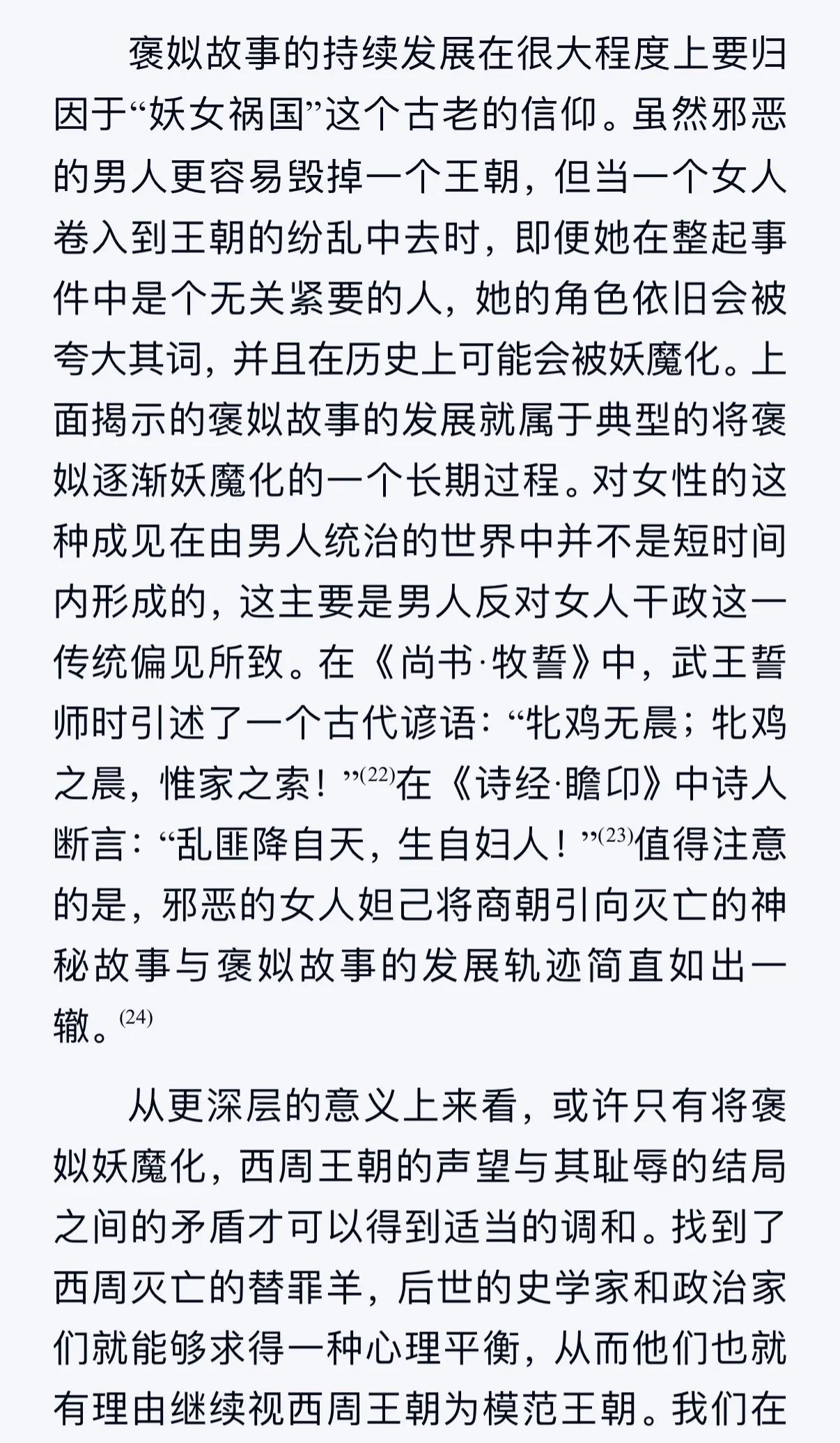 孔子在《论语·卫灵公第十五》中赞叹夏、商、西周:“斯民也,三代之所以直道而行也。”可惜,君王和民众都如此正直的西周却被犬戎(这名字明显是蔑称)所灭。按孔子的逻辑推理,要么是西周君王和民众“不行直道”,要么是犬戎比西周更“直”。两个推理结果都把孔子的评论置于尴尬之地。 于是,后世儒者把西周灭亡根源指向“褒姒”,这是维护孔子正确性极其方便快捷的方法。不用分析复杂的情况,不用指责西周的政策,就一句“都是那个女人的错”,一切都理所当然了。历史 孔子