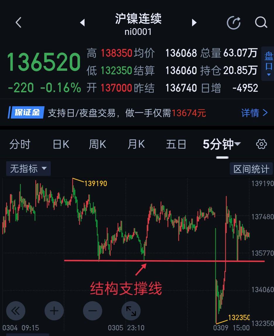 沪镍,目前仍是围绕图(1)的区间震荡。 日盘快速跌破图(2)的支撑线,但在五分钟图上并未形成有效的买、卖点。 夜盘,135280能否有效站稳是关键。若站稳,132350可当新的三十分钟一笔上的起始点,暂用三十分钟一笔上的视角跟进。如不能站稳135280,短期仍有向129300附近寻找支撑的可能。(今天早些时候的文章,有沪镍走势结构更详细的分析)。
