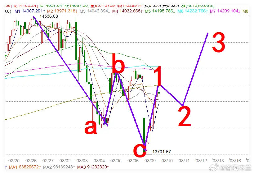 二.技术面:从结构看今天下午深圳成指走的是1浪了,后面即使回踩也难新低了,这意味着还会继续涨!