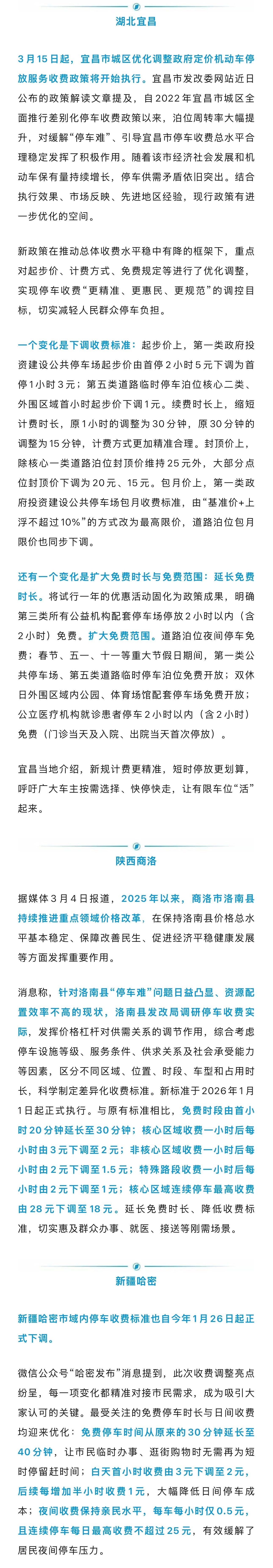 【#多地下调停车费#】2026年以来,湖北宜昌、陕西商洛、新疆哈密等地相继宣布下调公共停车场和道路泊位停车费。详细戳图↓↓了解。网页链接