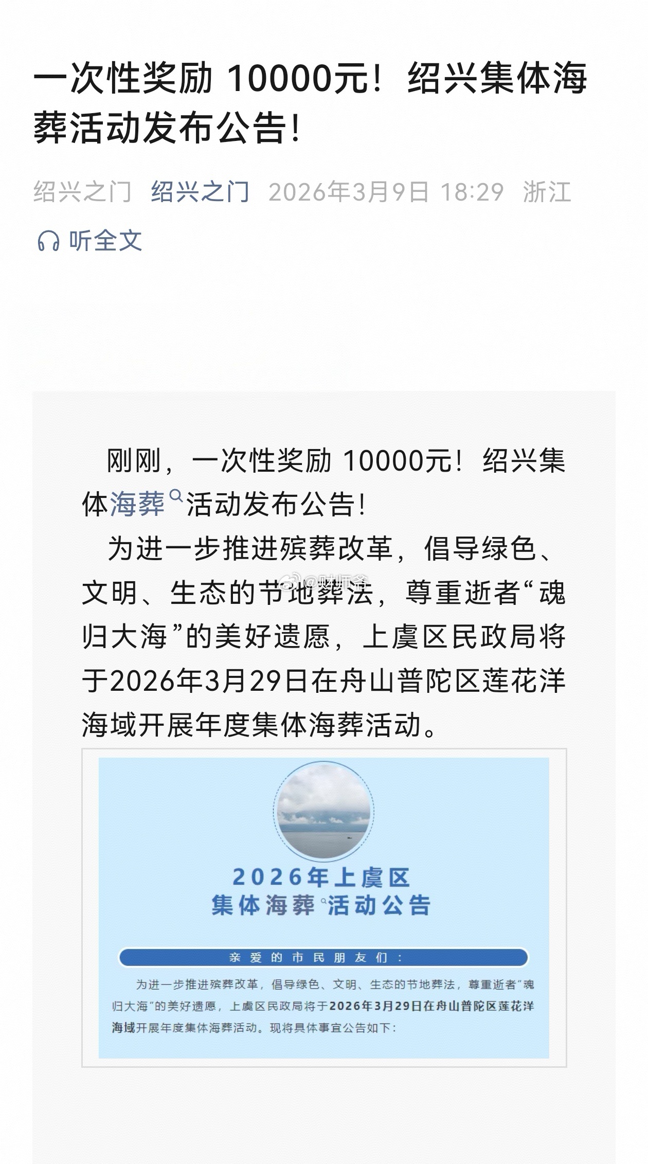 绍兴市上虞区民政局将于2026年3月29日在舟山普陀区莲花洋海域开展年度集体海葬活动。参加海葬的,家属给予一次性1万元奖励。