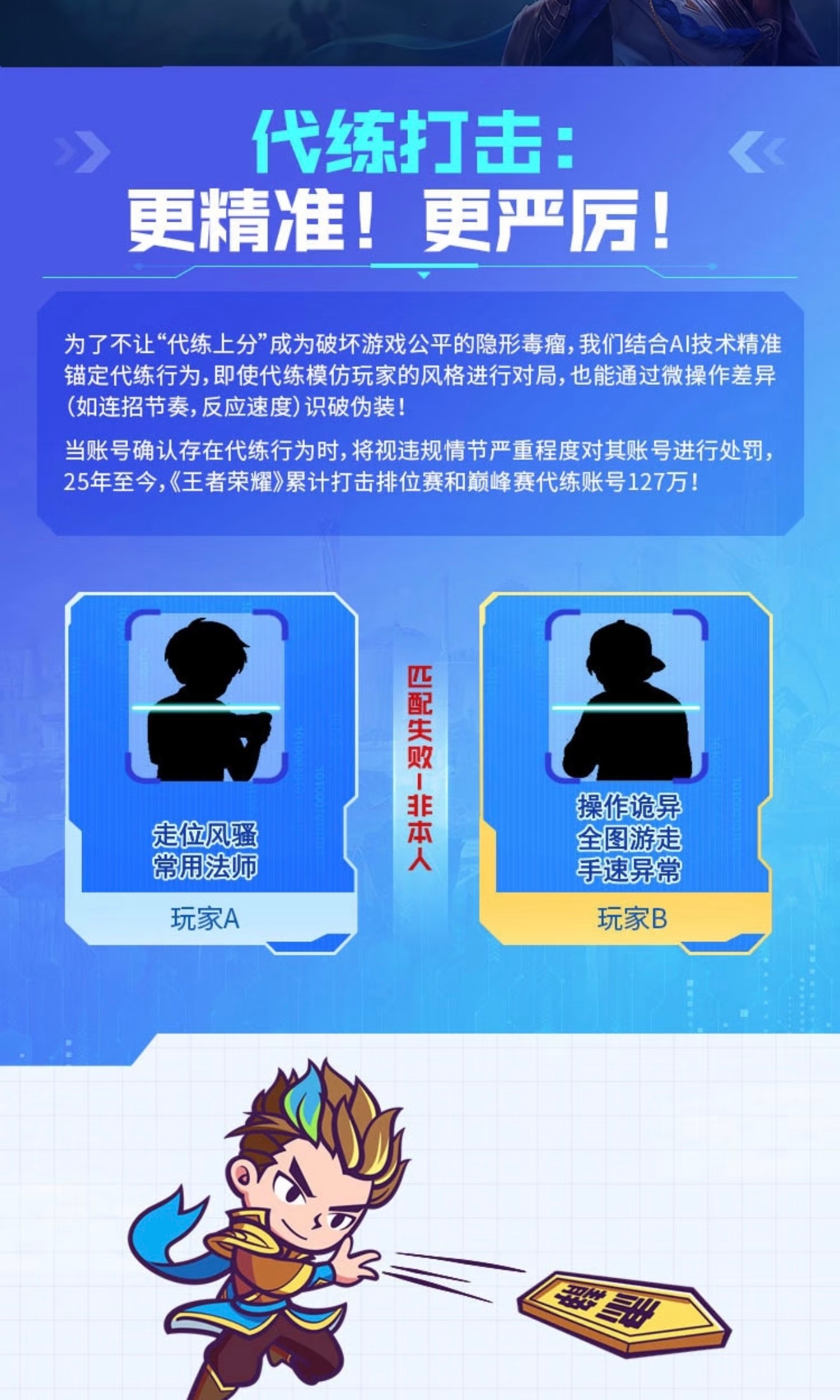 以后别再找代练啦~王者荣耀打击代练上分现在有AI技术精准识别代练行为,通过微操作差异、连招节奏、反应速度等维度识破伪装,即使模仿玩家风格也难逃检测。2025年至今,《王者荣耀》累计打击排位赛和巅峰赛代练账号127万!