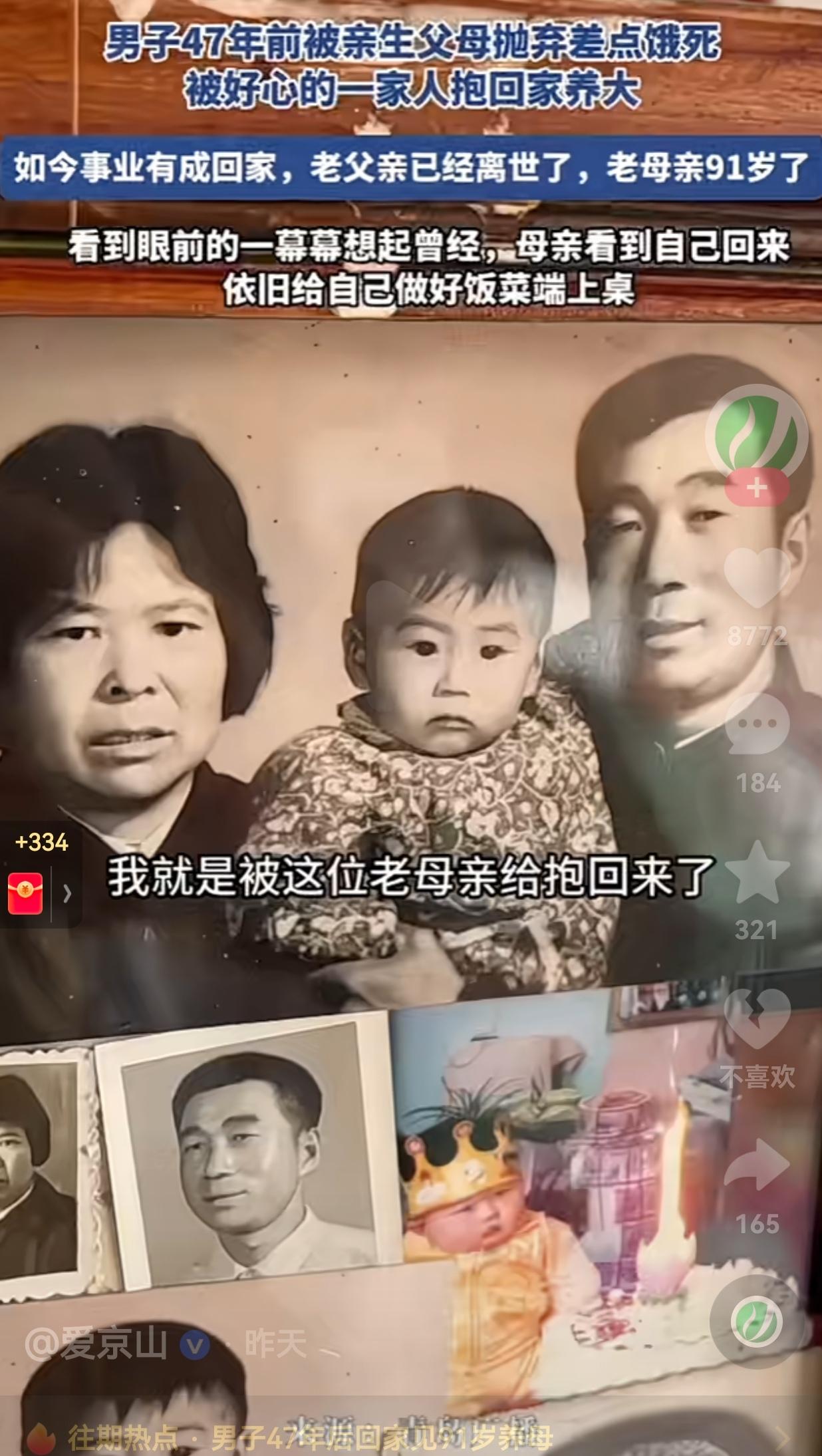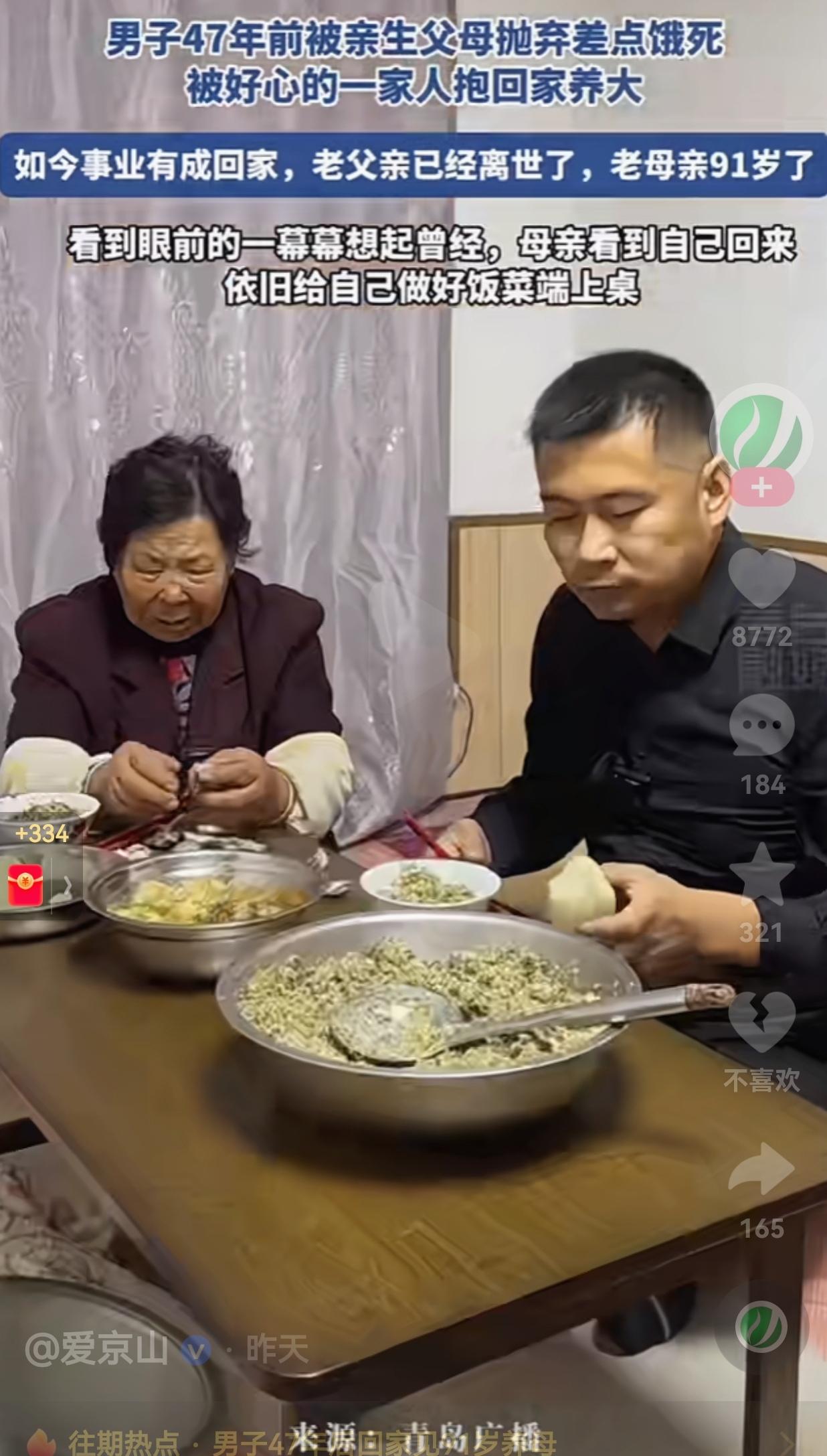 破防了!山东,一位中年大哥的经历,真的让人既心疼又感动。 47年前,他还是个嗷嗷待哺的婴儿,被亲生父母狠心抛弃,扔在路边差点饿死。是这对好心的夫妻,于心不忍,把他抱回了家,当成亲生孩子一样拉扯大。 如今47年过去了,大哥早就事业有成,开着奥迪衣锦还乡。可当他推开老家那扇熟悉的木门,心里五味杂陈。 养父早已离世,家里只剩下91岁的养母。看到儿子回来,老太太啥也没说,颤颤巍巍地钻进厨房,忙活了大半天,端出一桌子热菜——全是大哥小时候最爱吃的味道。 大哥对着镜头哽咽着说:“我就是被这位老母亲抱回来的。” 镜头扫过墙上的老照片,当年襁褓里小婴儿,如今已成了顶天立地的汉子。可在91岁养母面前,他永远是那个需要被疼爱的孩子。 饭桌上,老母亲眯着眼睛,一边给大哥夹菜,一边反复念叨:“多吃点,外面的饭哪有家里的香。” 大哥手里攥着馒头,低着头,眼泪噼里啪啦往碗里掉。这一幕,谁看了不心酸? 网友看到后评论说:“养恩大于天!这位妈妈太伟大了,大哥也是懂得感恩的好孩子!” 也有的网友说: “看哭了,不是奥迪有多贵,是91岁老人的热饭太暖,是这份情太真!” 还有的网友说: “亲生的又怎样?抛弃孩子的那一刻,就不配当父母了!” 要我说,这位大哥是不幸的,一出生就被亲生父母抛弃。但他又是无比幸运的,遇到了用一生爱他的养父母。 他说的那句“我这辈子,只认这一个妈”,重如千钧。 是啊,生恩虽大,养恩更重。十月怀胎是恩情,四十七年的含辛茹苦,更是刻在骨子里的深情。 我们总在拼命赶路,总想着赚大钱、开好车、住大房子,总觉得“衣锦还乡”才对得起父母的付出。 可这个视频狠狠给我们上了一课:父母从来不在乎你开什么车、有多少钱。在他们眼里,你永远是那个长不大的孩子。他们要的从来不多,不过是你常回家看看,陪他们吃顿饭,说说话。 所以说,别等来日方长,想好了就现在,因为91岁的高龄,真的是见一面就少一面,陪一顿饭就少一顿饭。 对此,你有什么看法呢?欢迎大家评论区讨论留言。 (信息来源:爱京山)