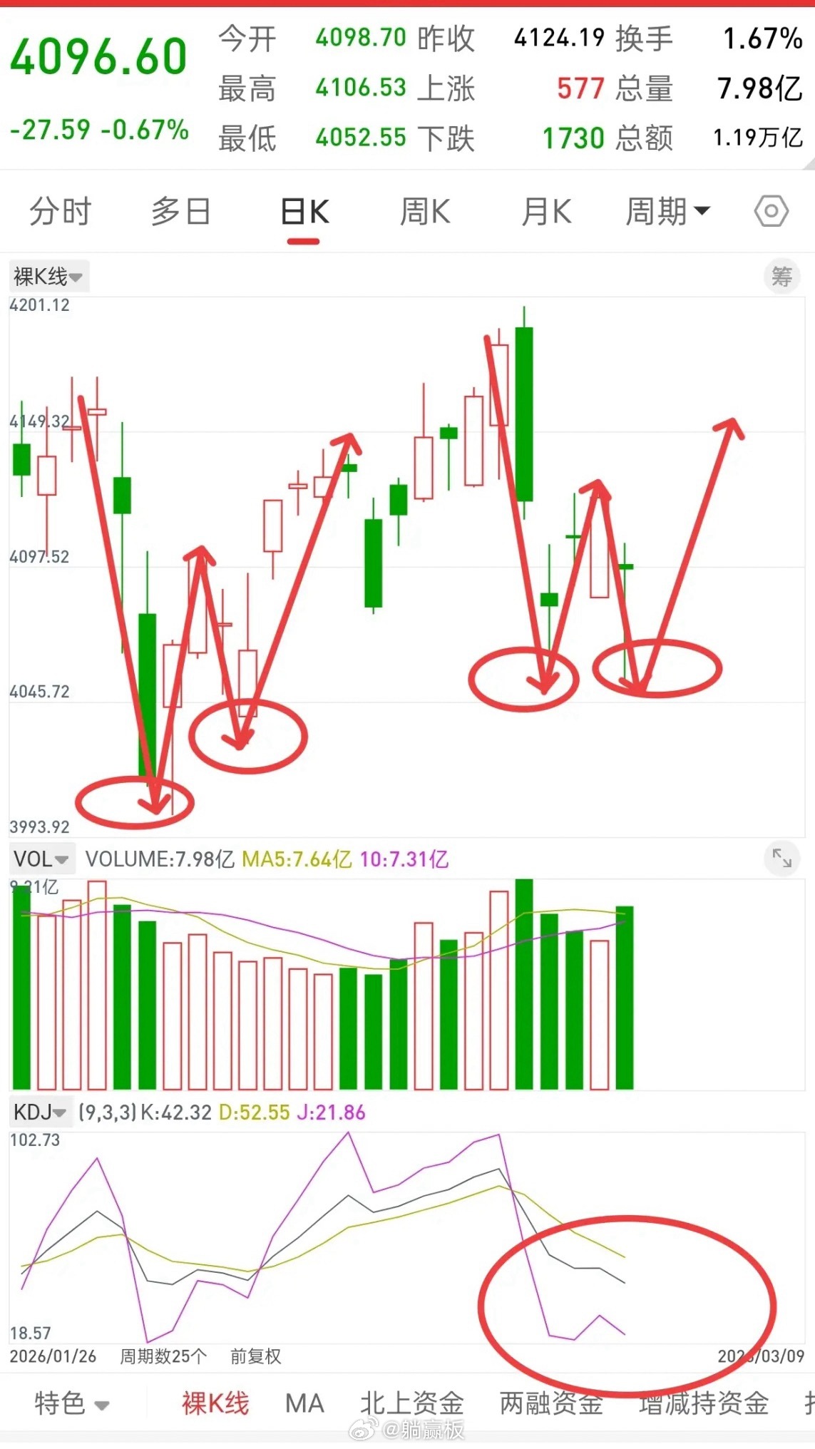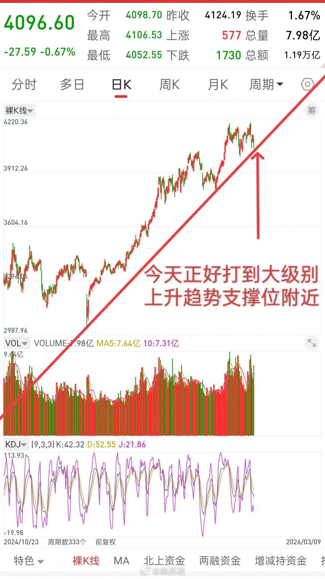 先说观点,明天如果低开,或者往下探,将会是本周最后的底部上车机会,而且即使明天再往下探,行情都可能很难跌破4052了。
