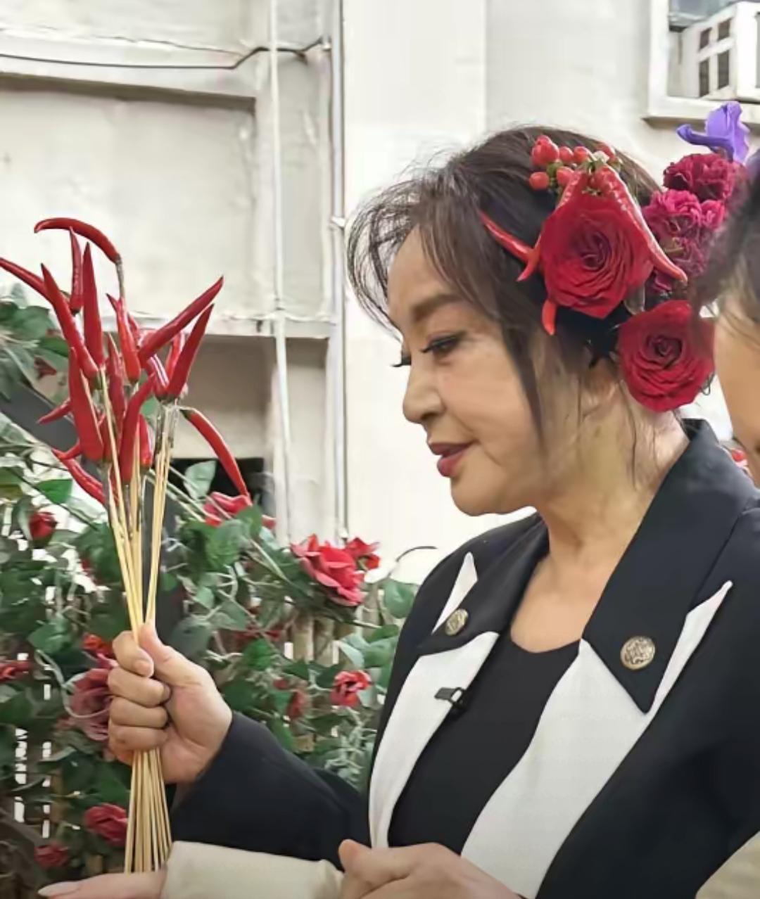 刘晓庆回重庆了,头戴鲜玫瑰花,和小红椒,手里拿着也是红辣椒,刘晓庆晓得合不拢嘴。