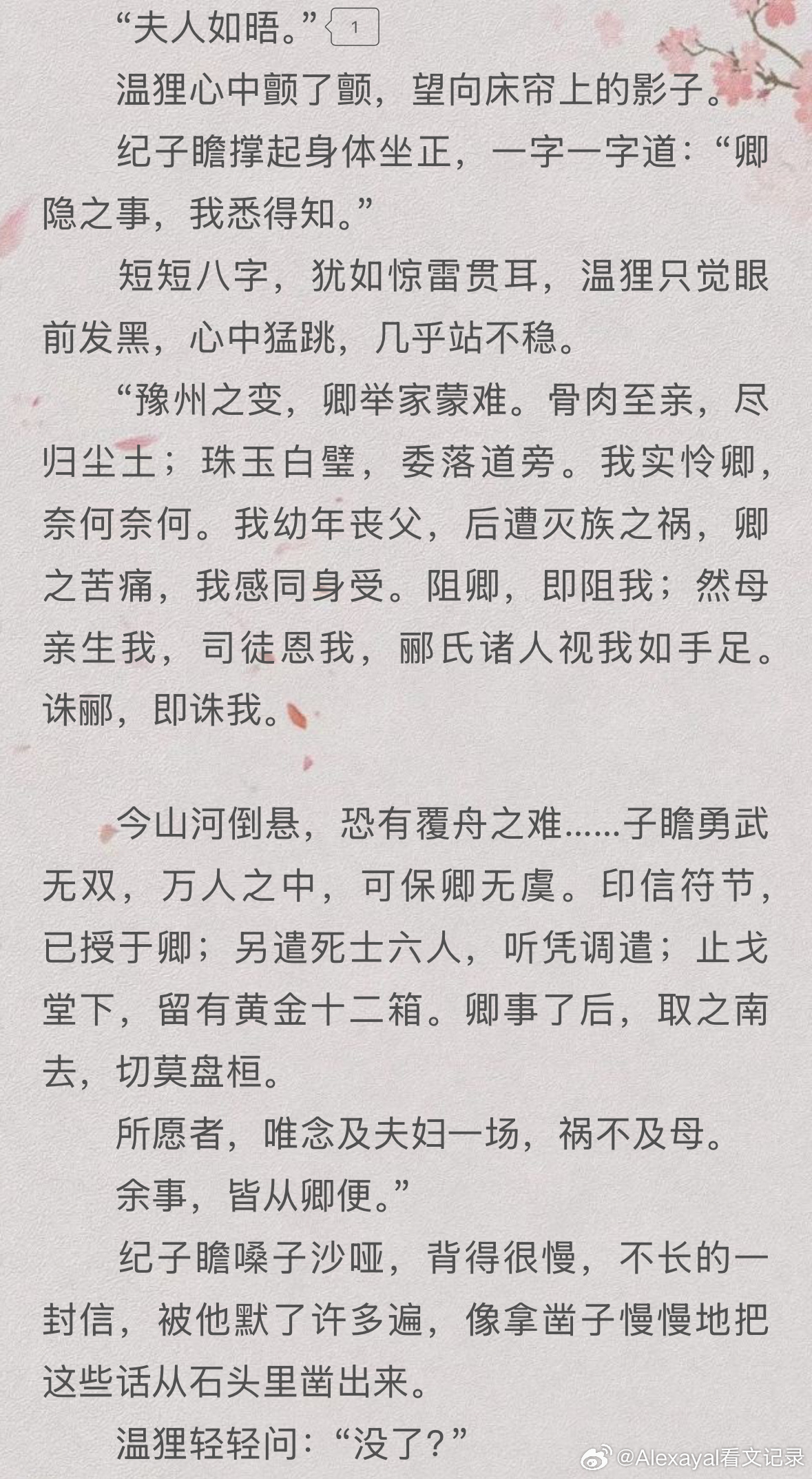 吾遭大变,阖门蒙难,遂辞故土,隻身赴秣陵。经年漂泊,乡关无人相候。宫闱数载,几历生死,幸遇良人。然事难两全,彼有养育深恩,吾有血仇待雪。今山河倾覆,将军身系社稷,妾亦负家仇,恐难长伴君侧。唯愿君安,虽隔天涯,此心不移。