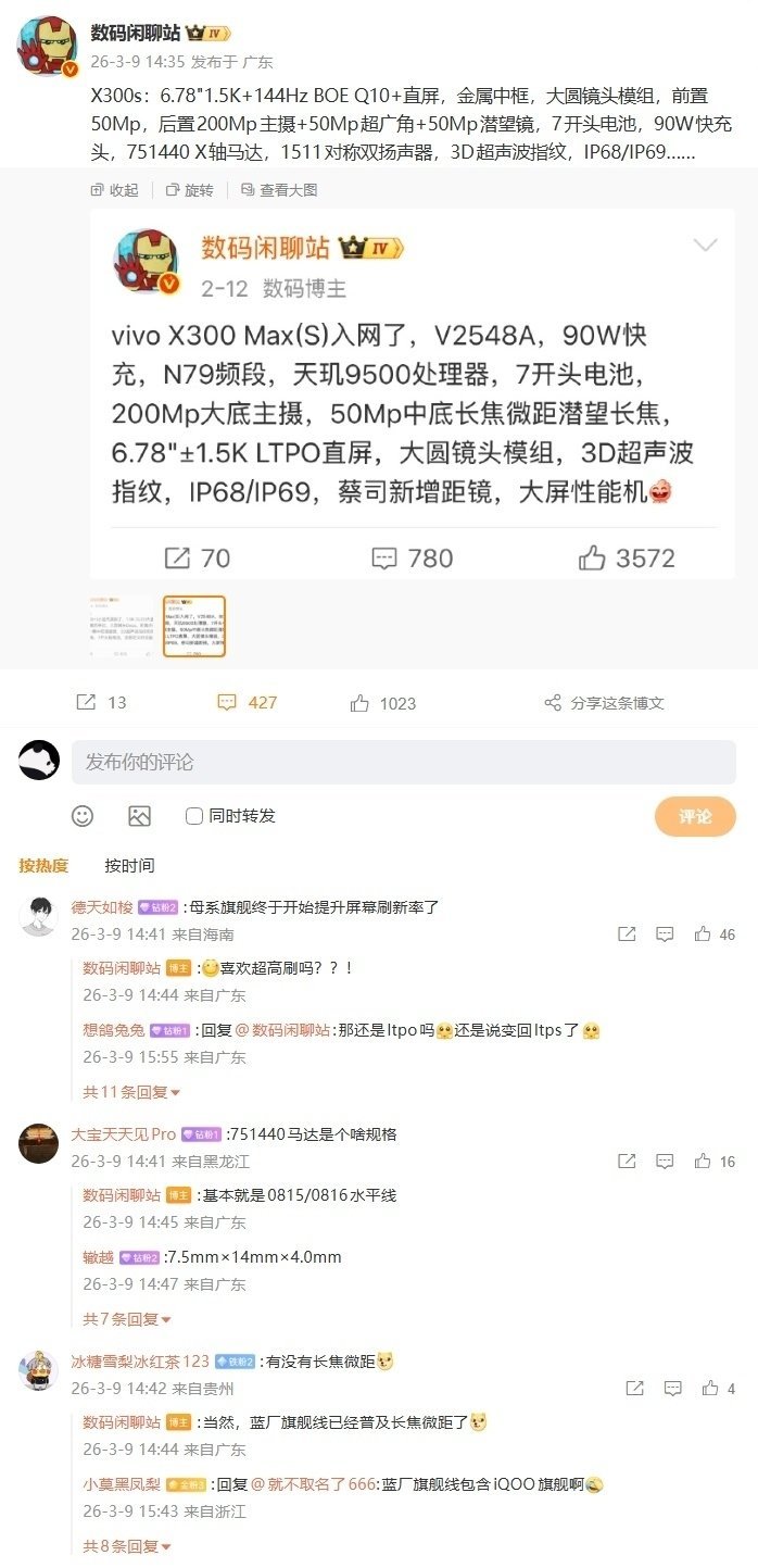 【vivo X300s 新机核心配置曝光:6.78 英寸1.5K+144Hz BOE Q10+ 直屏、配 7000mAh 级容量电池】