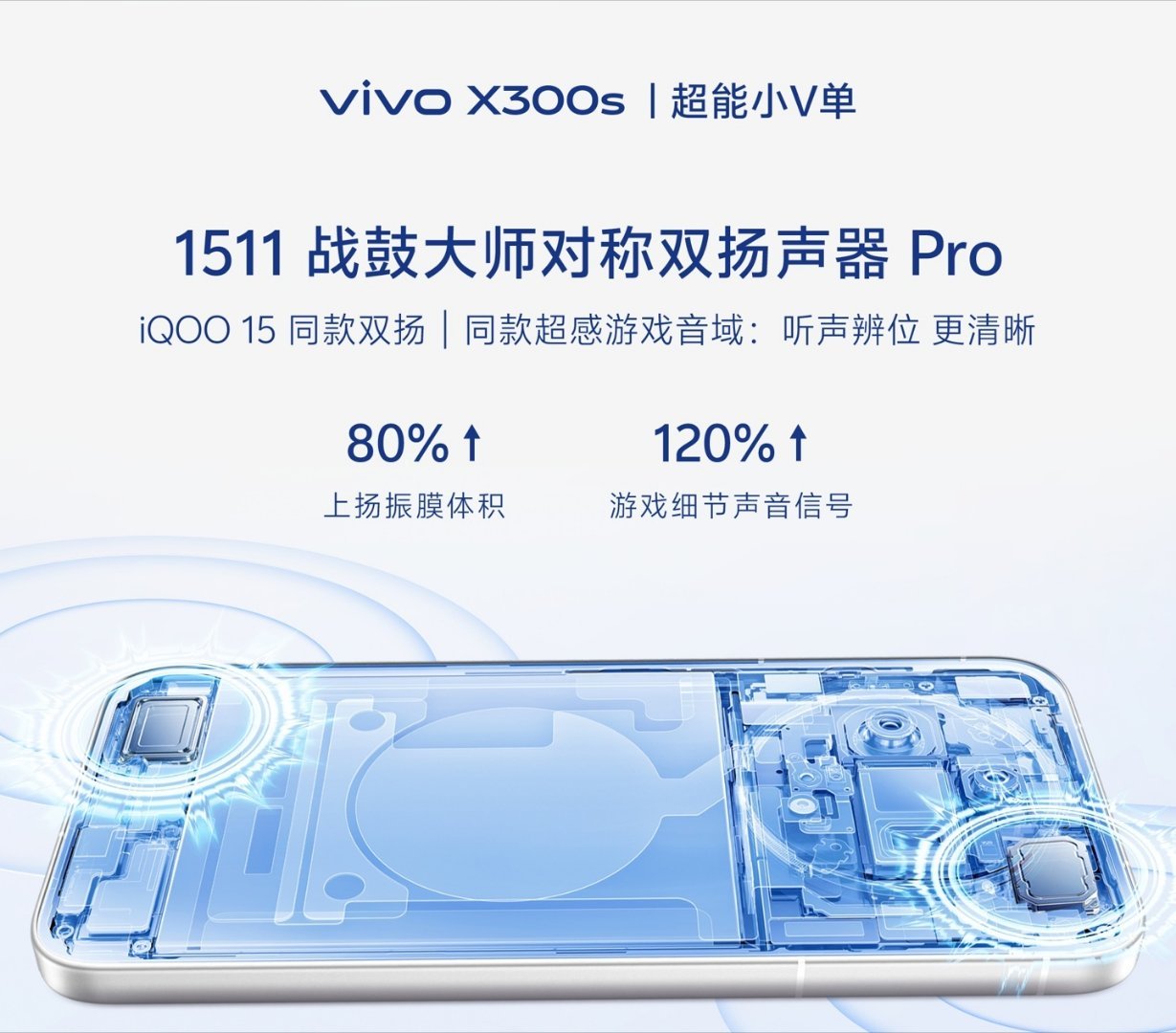 2. 1511 战鼓大师对称双扬声器 Pro,iQOO 15 同款对称双扬,还升级新一代功放和算法,上下均是 1511,超大尺寸,超宽声场。同时配备 iQOO 15 同款超感游戏音域,游戏细节声音信号直接提升 120%,听声辨位能力大幅增强,脚步声 / 枪声更显著。