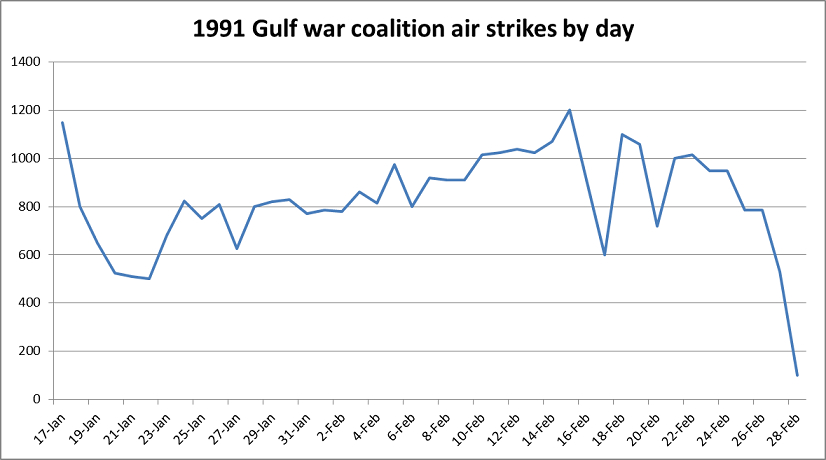 2014年12月17日,澳大利亚智库战略政策研究所(ASPI)报道,根据详尽记载的1991年海湾战争空袭行动的相关数据。"沙漠风暴行动"43天期间联军对伊拉克目标空袭的原始数据。根据1993年托马斯·A·基尼与埃利奥特·A·科恩编撰的《海湾战争空中力量调查报告》(PDF版)重新绘制的附图,展示了开战以来43天内每日空袭架次。