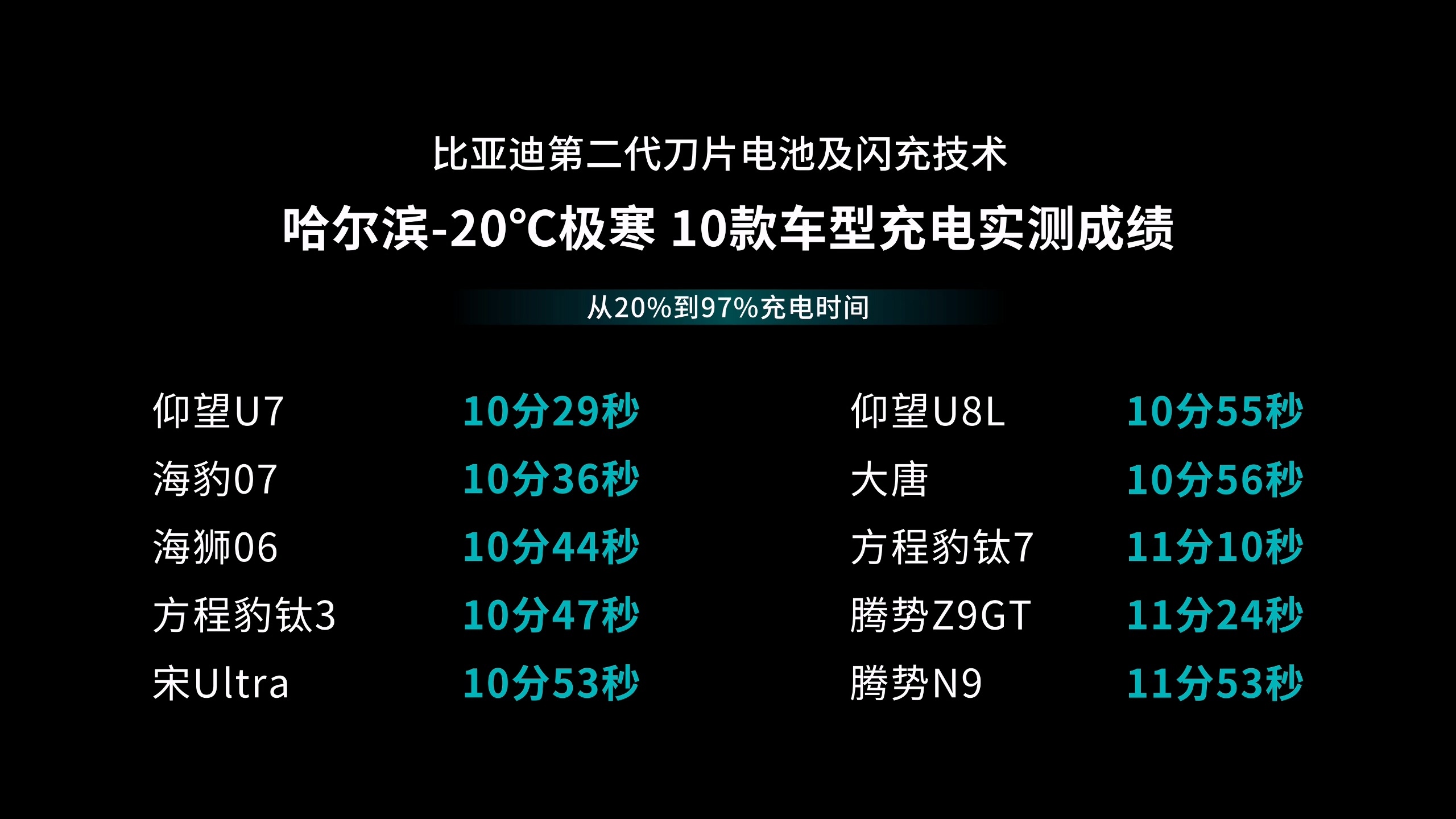都说比亚迪六年磨一刀,这次的闪充技术真的太硬核了,全汽车圈知名自媒体和新闻媒体都来见证比亚迪在哈尔滨-20℃(实际气温最冷是-29℃)零下严寒状况下的充电速度,事先对电池进行冰封24小时,电池彻底冻透,通过实测,比亚迪仰望U7、海豹07、海狮06、方程豹钛3、宋Ultra、大唐、钛7、腾势N9等等,都是7分多钟就能充到70%、80%以上,而充至97%的时间,比常温状态下也只不过由9分钟仅仅增加了3分钟,在12分钟以内全部完成了从20%充至97%的极速充电。