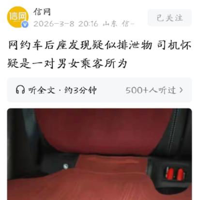 天津,网约车司机送完一对年轻男女后,往后座一看,竟发现后排坐垫上糊着一堆土黄色,稀稀的东西,看着就像人的排泄物。司机恶心的不得了,戴了两层口罩才收拾干净。恶心之余他觉得特别气愤,年轻人看着光鲜亮丽,怎么素质这么低,能干出这种事。于是,他联系平台要求赔偿,但平台的回复让他无语。 那天晚上订单特别多,司机忙得脚不沾地,接完这对男女的时候,已经快晚上十点了。路程不算远,也就十几分钟,男乘客上车的时候身上带着点烟味,司机也没多在意,毕竟跑网约车这么久,什么样的乘客都见过。为了散味,他全程开着点窗户,还特意把车内的香氛开得大了点,想着能让乘客舒服点,也能保持车内干净。 送完两人,司机想着趁空去给车充个电,也好歇口气。车子停稳,车内的阅读灯自动亮了,他习惯性地往后座扫了一眼,就这一眼,差点没吐出来。后排坐垫上,一滩土黄色的糊状东西糊在上面,稀稀拉拉的,凑近了闻还有股难闻的味道,明眼人一看,就像是人的排泄物。 司机当时就懵了,缓过神来就一阵恶心,赶紧翻出后备箱备用的口罩,一下戴了两层,又找出湿巾和除味剂,蹲在车后座一点点清理。那东西黏在坐垫上,特别难擦,他足足擦了十几分钟,手都酸了,又喷了好几遍除味剂,才勉强把表面的污物清理干净,但坐垫缝隙里还是有残留的味道,怎么也去不掉。 清理完之后,司机的火气一下子就上来了。他开网约车这么多年,向来注重车内卫生,常年在车里备着清洁用品,就怕乘客弄脏车子,可还是遇上了这种糟心事。他不是心疼那点清洁费,是气那对年轻男女的态度——明明弄脏了别人的车,却连一句道歉都没有,悄无声息地就走了,仿佛什么都没做过。 为了确认是不是这对男女留下的,司机调出了车内的监控,一帧一帧地回看。监控里看得清清楚楚,倒数第二波乘客下车后,后座还是干干净净的,没有一点污渍;而这对年轻男女上车后,全程虽然没什么异常动作,但下车之后,后座就出现了那滩污物。女乘客上车时拎着东西,监控显示那些东西一直放在脚垫上,下车时也全部带走了,不可能是行李弄出来的污物。 确认责任人之后,司机立马联系了网约车平台,说明了情况,希望平台能出面联系这对乘客,让他们承担相应的赔偿,至少得覆盖清洁费和自己耽误接单的损失。可平台的回复,却让他瞬间无语。平台客服只是敷衍地说,会尽快核实情况,让他先自行保留证据,还建议他报警处理,除此之外,没有任何实质性的解决方案,也没说会怎么协调乘客赔偿。 司机当时就犯了难,那时候已经快凌晨了,真要是报警,折腾下来最少也得两三点,他跑网约车只是兼职,第二天还要出差,根本耗不起这个时间和精力。他又跟平台反复沟通,希望平台能主动联系乘客,可客服始终就是那几句官话,要么说联系不上乘客,要么就让他继续等消息。 直到第二天晚上,平台才给了司机回复,说已经核实了情况,也尝试联系过涉事乘客,但始终没能接通电话,最终平台先行垫付了他的清洁费用,一共237.5元,其中包括220元的洗车费和17.5元的清洁用品费。钱是拿到了,但司机心里还是堵得慌,他说,这不是钱的事,是咽不下这口气,更是觉得,这种行为不该就这么不了了之。 其实这事儿,不止司机觉得委屈,不少网友看完也都替他打抱不平。有人说,现在很多年轻人,只顾着自己光鲜亮丽,却完全不顾及别人的感受,素质早就丢到九霄云外了;也有人说,网约车司机挣的都是辛苦钱,车子就是他们的饭碗,弄脏了车子,耽误了接单,损失远不止那点清洁费。 反过来想想,也不是所有乘客都这样。有很多乘客坐车时,会主动爱护车内卫生,不小心弄脏一点,都会主动道歉,还会主动提出赔偿。之前就有乘客不小心把奶茶洒在车内,二话不说就转了清洁费,还反复跟司机道歉,对比之下,这对年轻男女的做法,就更显得没素质、没担当。 这起看似不起眼的小事,其实暴露的是当下一些人的素质短板。光鲜的外表,从来都不能代表高尚的品德;年龄小、长得好看,也不是逃避责任的理由。 网约车是公共出行工具,需要司机和乘客共同爱护,司机用心提供服务,乘客也要懂得尊重别人的劳动成果,这是最基本的做人底线。 现在问题来了,要是你是这位网约车司机,遇上这种事,会选择报警维权,还是自认倒霉?要是你是平台,又会怎么处理这件事,才能既维护司机的权益,又能约束乘客的行为?还有那些不小心弄脏他人财物的人,到底该怎么做,才能体现自己的素质和担当? 说到底,素质从来都不是挂在嘴边的口号,而是体现在每一件小事里。一句道歉,一次主动承担,就能看出一个人的品行。 希望这起事件,能给每一个人提个醒,尊重别人的劳动,爱护公共财物,既是对别人的体谅,也是对自己的尊重。