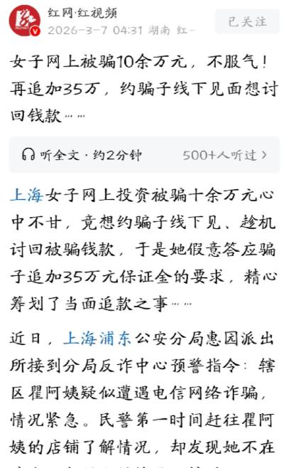 电视都不敢这么演!上海,大妈在网上投资了十几万,本想着大赚一笔,谁知却被骗了个精光。她不甘心,竟然想着约骗子线下见面,想办法把被骗的钱追回来。所以,她将计就计,假装答应骗子,说想要追加35万保证金,并和对方约好了见面地点。万万没想到,见面后的情况,跟她想象中完全不一样。 大妈一辈子攒点钱不容易,就想着能让钱生钱,减轻点家里负担,一看这条件,立马就动了心。没多犹豫,就按照对方的指引,下载了一个陌生的理财APP,一开始还试探着投了几千块,没想到没过两天,APP上真的显示赚了几百块,还能顺利提现。 这一下,大妈彻底放下了戒心,觉得自己找到了“发财门道”,转头就把自己攒了好几年的十几万养老钱,一股脑全投了进去。 投完钱之后,大妈天天盯着APP看,就盼着本金翻倍,可没等她高兴几天,麻烦就来了。她想再提现一点零花钱,却发现APP根本登不上去,之前联系的“理财顾问”也变得敷衍起来,要么不回消息,要么就找各种借口推脱,说什么“系统维护”“资金冻结”,让她再等等。 大妈这才慌了神,试着联系客服,却发现客服电话早就成了空号,这时候她才反应过来,自己是被骗了。 十几万,不是小数目,那是大妈的养老钱,也是应急的钱。被骗之后,大妈没敢立马告诉家人,心里又急又气,越想越不甘心,凭什么自己辛苦攒的钱,就这么被骗子骗走?她思来想去,没想着报警,反而冒出了一个大胆的念头——约骗子线下见面,当面把钱要回来。 大妈也算有点心思,她没有直接戳穿骗子,而是顺着对方的话来。骗子见她还没醒悟,又开始忽悠她,说只要再追加35万“保证金”,就能解冻之前的资金,到时候连本带利一起还给她,赚得更多。 大妈假装被说动,一口答应下来,还故意表现得很急切,说自己已经凑齐了35万,但不放心线上转账,要求跟对方线下见面,当面交款。 骗子大概是觉得大妈已经被彻底套牢,又贪又傻,根本没多想,就答应了见面要求,还跟大妈约定了一个路口作为见面地点。 大妈挂了电话,心里既紧张又期待,她想着,只要见到骗子,就跟对方软磨硬泡,实在不行就报警,总能把钱追回来一点。为了有个照应,她还悄悄叫上了自己的丈夫,一起赶往约定地点。 可万万没想到,等他们夫妻俩赶到约定地点,见到的人,根本不是那个天天跟她聊天的“理财顾问”,更不是幕后骗子。 那人看着三十多岁,神情慌张,见面第一句话就问大妈,35万现金带来了没有。大妈故意说忘带了,想先跟他聊聊之前的投资事宜,那人一听,脸色瞬间变了,转身就想打车逃跑。 就在这时候,几个穿着警服的民警突然冲了过来,当场就把这个人控制住了。大妈夫妻俩当时都懵了,直到民警说明情况,他们才知道,原来警方早就通过反诈预警,发现大妈疑似遭遇电信网络诈骗,一直在找她,联系不上人之后,又通过家属得知了她要跟骗子见面的事,就提前在见面地点布控,就等嫌疑人现身。 后来经过审讯才知道,这个被抓获的人,根本不是骗子头目,只是一个被骗子雇佣的“车手”,专门负责转移涉诈资金,幕后的主谋早就躲在暗处,根本不会轻易露面。 这个“车手”对自己受他人指使,协助转移诈骗资金的事供认不讳,目前已经被依法刑事拘留,案件还在进一步侦办中。 民警当场就给大妈上了一堂反诈课,告诉她,现在的诈骗团伙分工特别明确,幕后主谋极少露面,都是靠下面的人层层忽悠,像她这样私自约见骗子,不仅要不回钱,还可能有生命危险。要是骗子发现她的意图,说不定会做出极端的事,到时候就得不偿失了。 大妈这才后怕不已,庆幸自己没有真的单独行动,也庆幸警方及时介入,没让她再陷入更大的麻烦。 其实这事,说大妈勇吧,确实够勇,被骗之后还敢主动约骗子见面,这份胆量不是谁都有;但说她糊涂吧,也真够糊涂,明知道被骗,不第一时间报警,反而想着靠自己的力量追钱,差点酿成大错。 反观我们身边,还有很多像大妈这样的人,尤其是中老年人,总想着“高收益”,容易被骗子的花言巧语迷惑,一步步掉进诈骗陷阱。 对比之下,这位上海大妈还算幸运,虽然被骗了十几万,但至少协助警方抓获了一名涉案人员,也给其他被骗的人争取了希望,更给所有人敲响了警钟。 说到底,骗子的套路其实并不高明,无非就是抓住了人们的贪念,用“高回报”“稳赚不赔”当诱饵,一步步诱导大家投入资金,等大家反应过来的时候,早就人财两空。 一旦发现自己被骗,千万不要像这位大妈一样,私自行动,最正确的做法就是第一时间报警,保留好聊天记录、转账凭证,配合警方调查,这样才能最大程度追回损失。 最后想问大家,你们身边有没有人遭遇过类似的投资诈骗?如果是你被骗了,你会选择第一时间报警,还是像这位大妈一样,试着自己追钱? 其实很多时候,我们多一份警惕,就能少一份损失,愿我们都能擦亮眼睛,守护好自己的辛苦钱,也提醒身边的家人朋友,远离虚假投资,警惕电信诈骗。