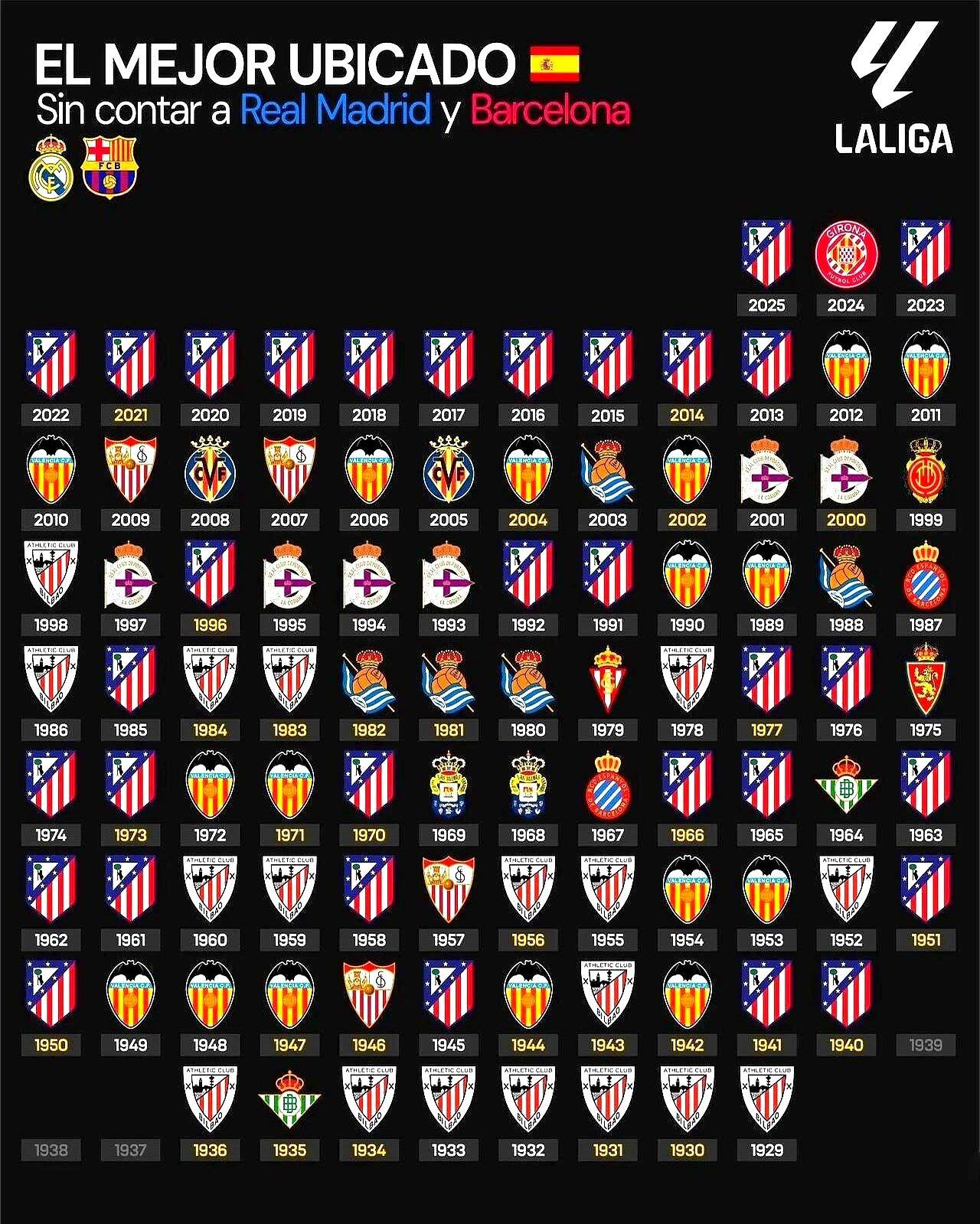 西甲第三的位置,西蒙尼直接焊死了14年,皇马巴萨换了8任主帅都撬不动。 2011年他刚接队的时候,马竞连续14个赛季没进过前三,欧战门票都要跟中下游队死磕。 现在他拿了俩西甲冠军,两次杀到欧冠决赛,25/26赛季踢完27轮,攥着54分稳坐第三,比第四名多了9分,欧冠资格早早就落袋为安。 哪有什么天生的西甲第三豪门,只有熬得久拼得狠的狠人,才能在巨头的夹缝里踩出自己的路。