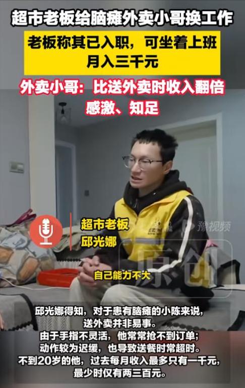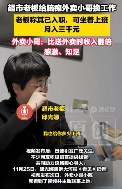 2025年11月,江苏宿迁超市一老板,由于一时疏忽让一外卖员在店内白白等了很久,她感到十分愧疚,果断发布寻人启事,寻找这位残疾外卖小哥,哪料见面后才发现,这位19岁小伙因脑瘫求职屡屡碰壁,月收入曾低至两三百元,没想到邱光娜的一个决定,不仅让他重获工作,还意外点燃了更多希望。   江苏宿迁的超市老板邱光娜,因为一时疏忽,打开手机飞行模式准备直播,没注意到前来送单的外卖员,让这位外卖小哥在店里白白等了很久。   等她后来通过监控看到这一幕时,心里满是愧疚,她看着小哥默默等待、没有丝毫抱怨的样子,越发觉得过意不去,于是果断决定发布寻人启事,一定要找到这位外卖小哥,好好跟他道个歉,也想弥补自己的疏忽。   经过一番寻找,邱光娜终于找到了这位外卖小哥,见面之后她才知道,这个小伙只有19岁,还患有先天性脑瘫,因为身体的原因,他在求职路上屡屡碰壁。   餐饮店嫌他手脚不够灵活,工厂流水线嫌他做事太慢,没有一家单位愿意接纳他,走投无路之下,他只能选择门槛最低的外卖行业,希望能靠自己的努力挣点生活费。   可外卖行业分秒必争,对速度和体力都有要求,脑瘫带来的身体不便,让他在送单过程中屡屡受挫,经常出现超时的情况,扣掉罚款之后,每个月到手的收入有时候低至两三百元。   这两三百块钱,对普通人来说可能不够一顿饭钱,可对这个19岁的小伙来说,却是他拼尽全力挣来的生存尊严,是他不向命运低头的底气。   了解到小哥的处境后,邱光娜心里更加不是滋味,她没有只简单道个歉、给点补偿就了事,而是做出了一个让所有人都暖心的决定——让这个小伙来自己的超市工作。   她不想用施舍的方式帮助他,而是想给这个少年一个真正的机会,让他靠自己的劳动获得尊重和收入。   邱光娜给小伙安排了合适的工作,不用风吹日晒送单,只需在超市里整理货架、核对库存,工作轻松且稳定,月薪3000元,还管饭,和超市里其他健全员工同工同酬。   这份工作,不仅解决了小伙的生计问题,更让他摆脱了之前的窘迫,慢慢找回了自信,不再因为身体的缺陷而自卑。   从那以后,小伙慢慢变得开朗起来,做事也越来越认真,虽然动作还是有些慢,但他总是尽自己最大的努力把事情做好,把货架整理得整整齐齐,慢慢也能胜任更多的工作,甚至能负责高峰期的电话派单。   邱光娜的这个善举,不仅改变了这个19岁小伙的命运,还意外点燃了更多希望。   周边的商户得知这件事后,都被邱光娜的善意打动,也开始关注残障人士的就业问题,不少人表示愿意为残障人士提供合适的工作岗位。   一个小小的疏忽,换来一场温暖的救赎,邱光娜用自己的善良,给困境中的少年撑起了一片天,也让更多人看到了善举的力量。