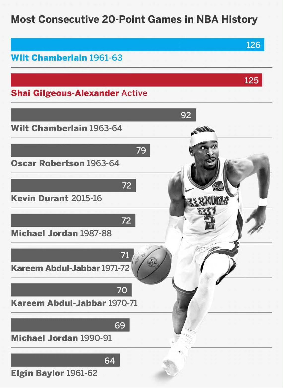 亚历山大上一次没能砍下20分已经要追溯到2024年10月31日对阵马刺的比赛,而今天他有机会追平张伯伦的历史纪录!