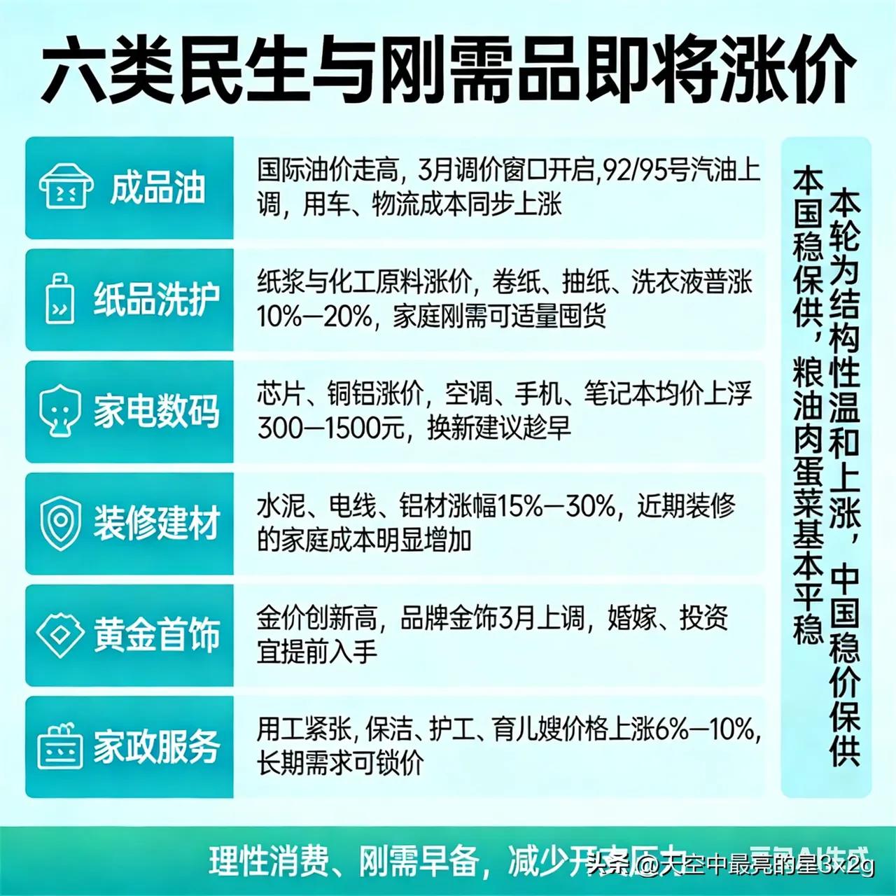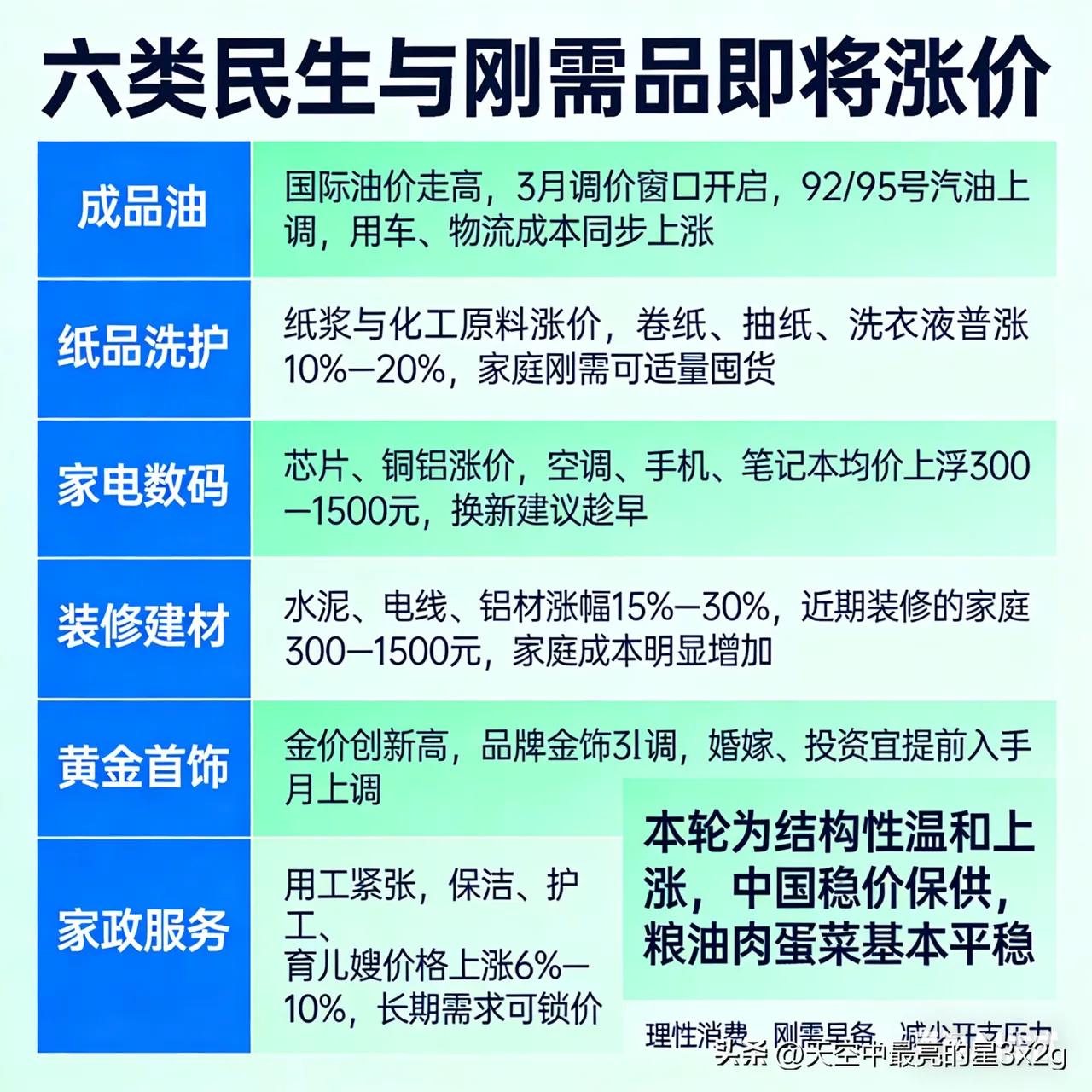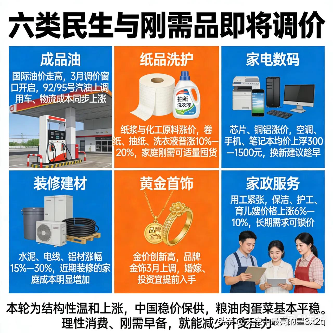 这六样东西马上涨价,普通家庭早知道能省不少钱! 受原材料、能源和用工成本上涨影响,民生刚需品迎来一波调价。成品油开启上调窗口,开车、物流成本跟着涨;纸品洗护因原料涨价普涨10%—20%,家里常用的可以适量囤货。家电数码受芯片、铜铝涨价影响,均价上浮几百上千元,想换新得趁早。装修建材涨幅明显,近期装修的家庭成本会增加不少。黄金首饰随金价走高同步上调,婚嫁、投资建议提前入手。家政用工紧张,保洁、护工等价格上涨6%—10%,长期需求可以提前锁价。 国家稳价保供,粮油肉蛋菜基本平稳,大家理性消费、刚需早备,就能轻松应对涨价。 你家最近会提前囤哪些刚需品?